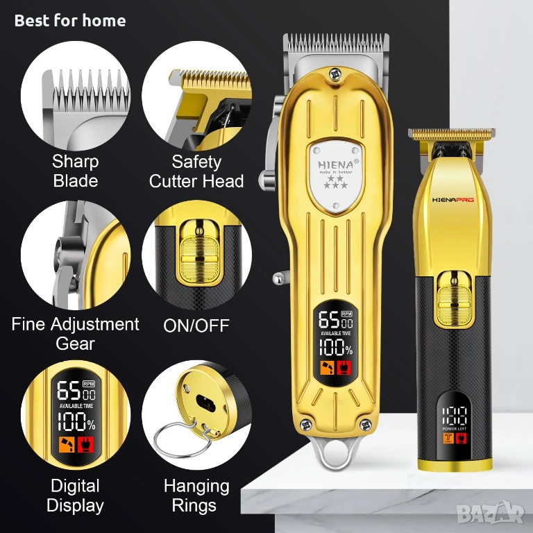 ИНТЕЛИГЕНТЕН LED ДИСПЛЕЙ Машинката за подстригване и тримерът в този комплект за подстригване HIENA PRO имат интелигентни LED екрани, които позволяват на потребителите да виждат процента на живот на батерията от 0 до 100, което позволява на потребителите да контролират времето за употреба по-точно.