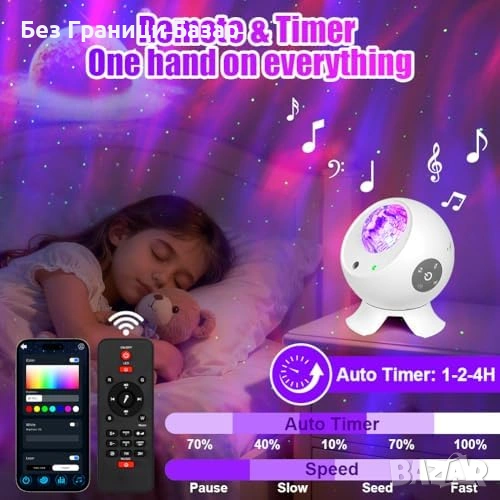 Управление чрез приложение + дистанционно: цвят, яркост, музика, звук