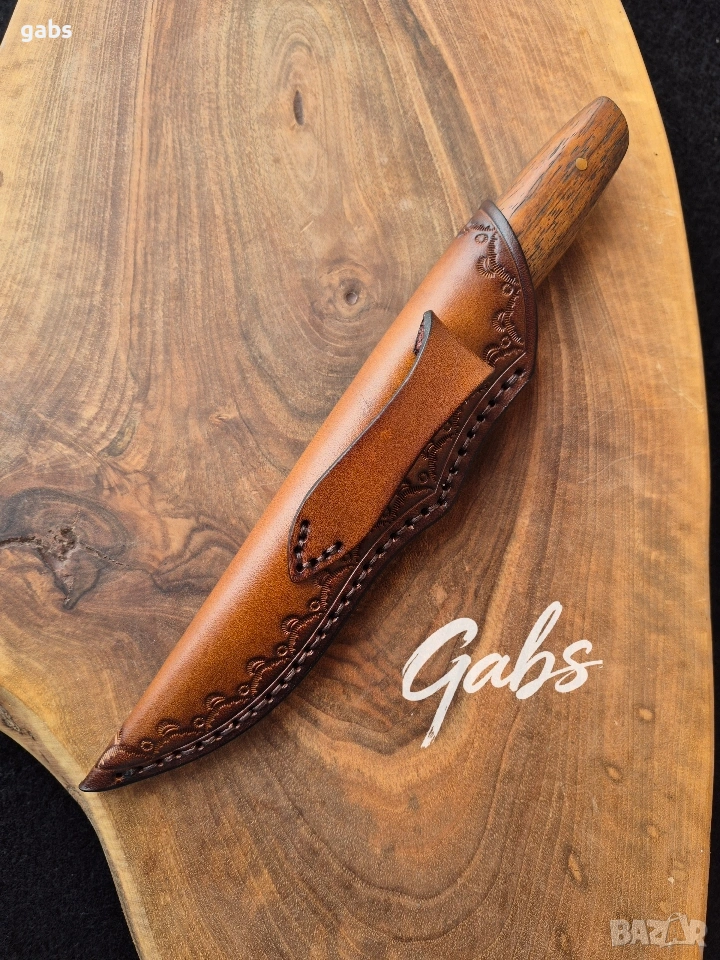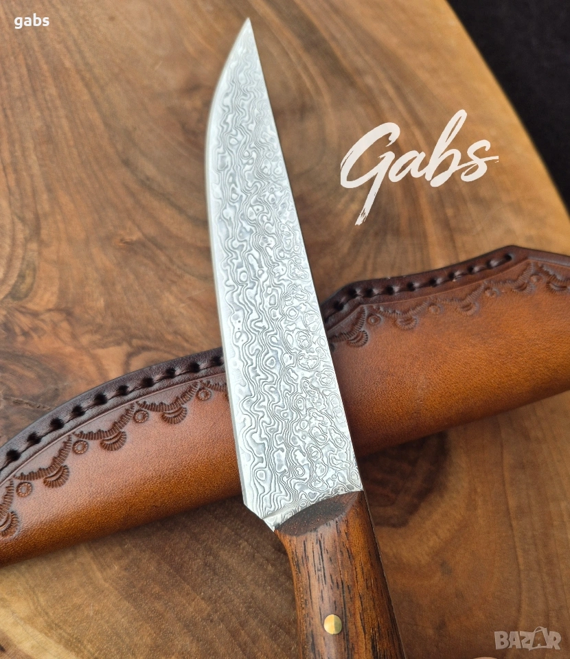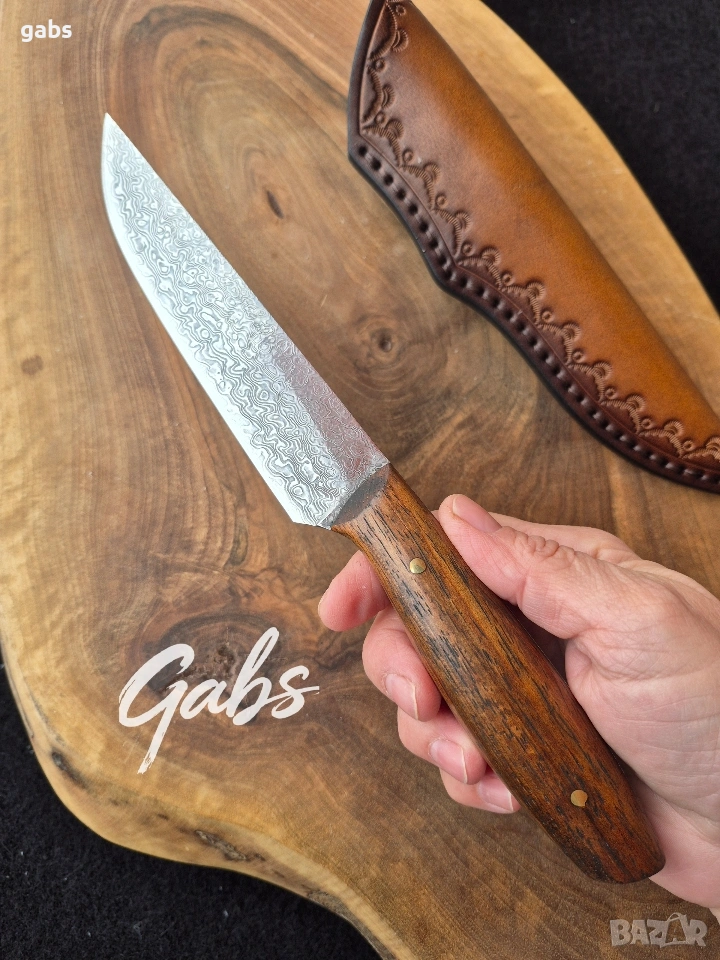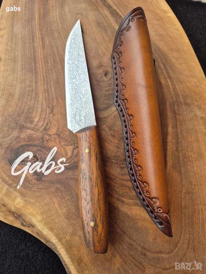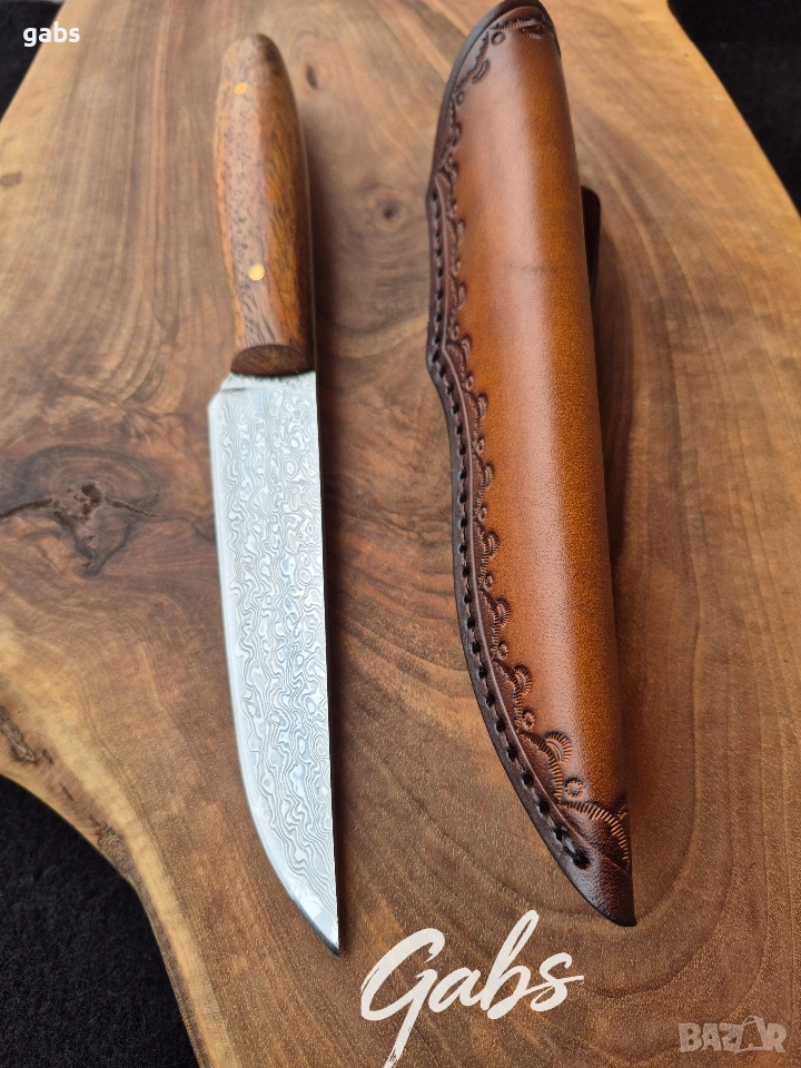 Ловен нож от дамаска стомана, комбинация от стилен дизайн и изключителна здравина и надежност.Фултанг с красива дървена дръжка и в комплект с кожена кания.