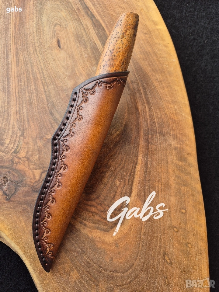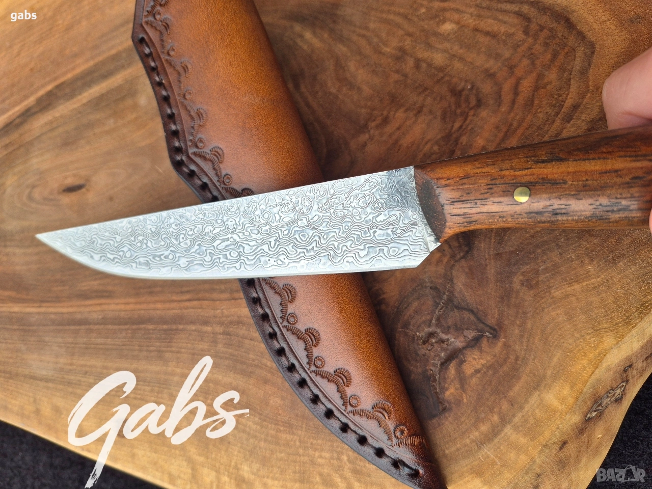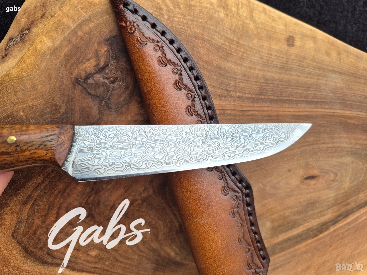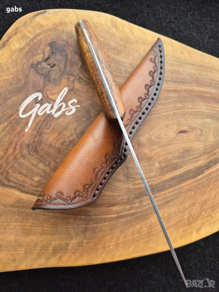 Ловен нож от дамаска стомана, комбинация от стилен дизайн и изключителна здравина и надежност.Фултанг с красива дървена дръжка и в комплект с кожена кания.