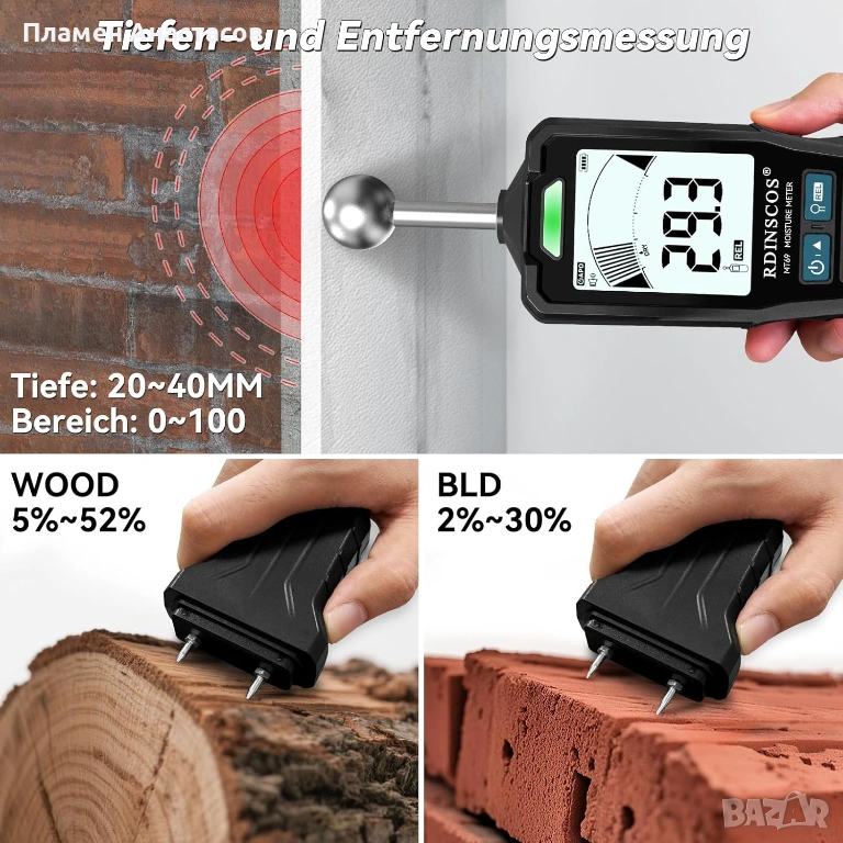 Уредът предлага широк измервателен диапазон, подходящ за дърво, гипсокартон, бетон, мазилки и други материали. Големият 2.9-инчов LCD дисплей с подсветка осигурява добра видимост, а цветната LED индикация показва нивото на влажност (ниско / средно / високо).