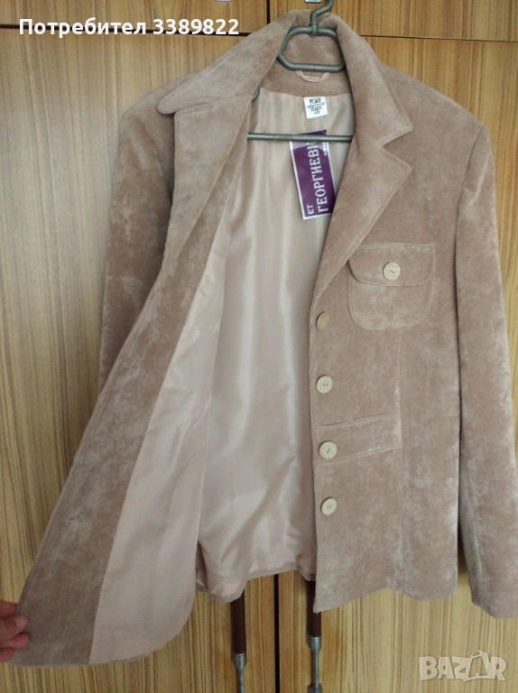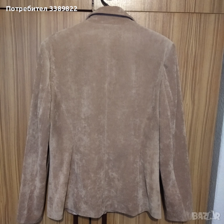 Продавам дамско кадифено сако - бежав цвят, дълъг ръкав, закопчава се с копчета, има два малки горни джоба, леко вталено. Дължина 66 см, дължина на цял ръкав 62 см. Размер M/L.
