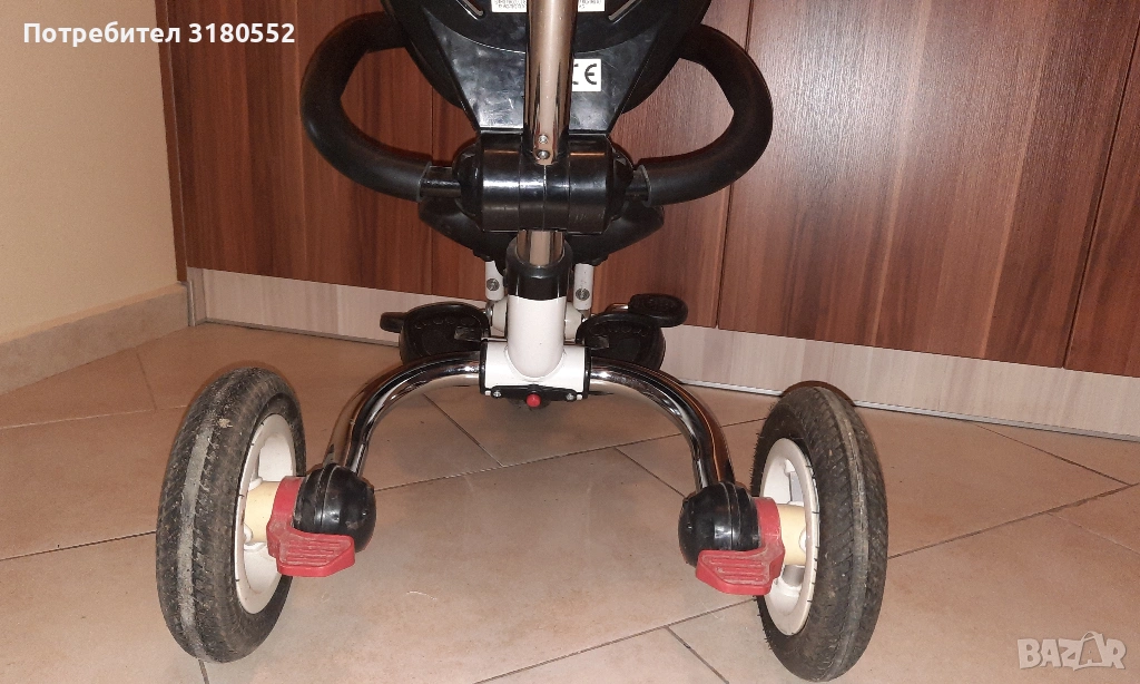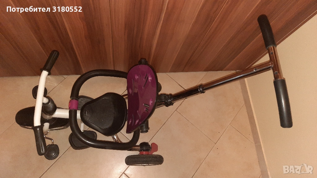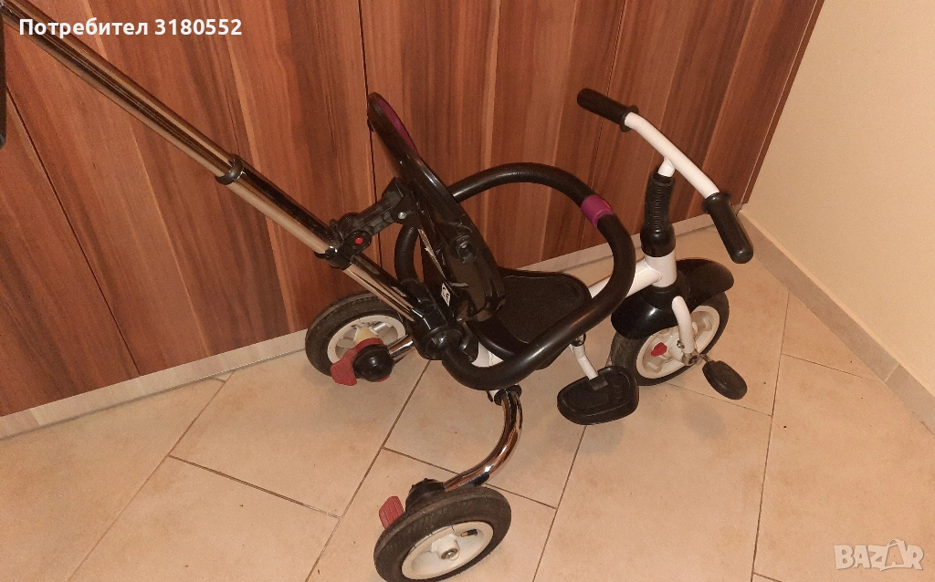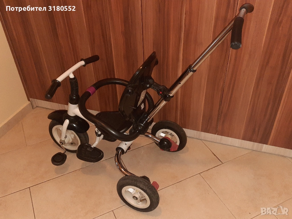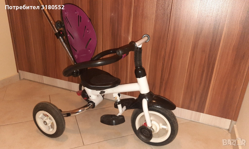 Продавам детска триколка с помпащи се гуми. Много е запазена – технически и визуално. Със задни спирачки. Може да се управлява и от детето и от родител. С регулируема дръжка. Разполага и със степенки за детето. За деца до 6 години и до 30 кг. За инфо –