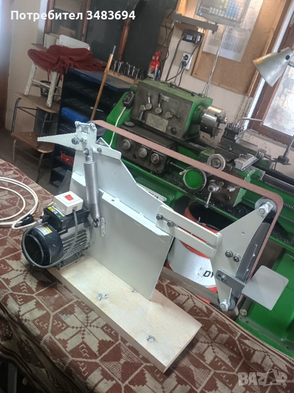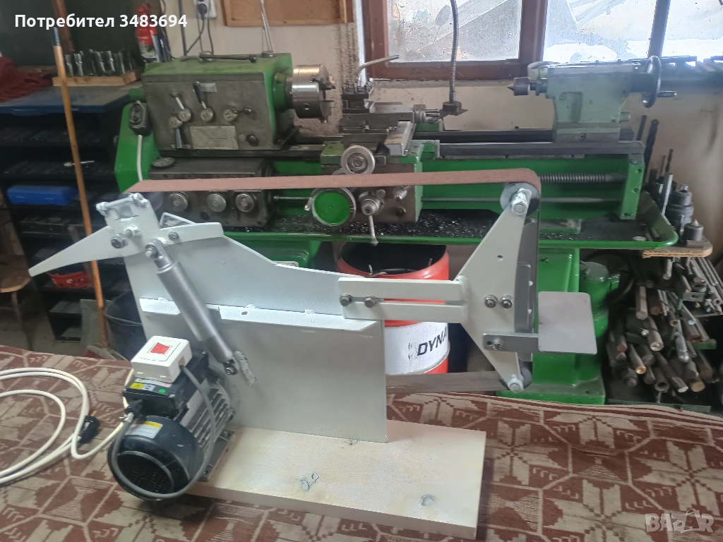 Лентов шлайф, гриндер. Машината е нова и работи перфектно. Без вибрации. Лента 2000 х 50 или 1980 х 50. Има възможност за работа с няколко вида ленти. . Мотор - 1.1 кв / ч. Обороти 2900. Ролки - текстолог. Нови лагери. Всичко е направено перфектно. При интерес мога да изпратя клип на Вайбър. Приставка за работно колело 180 или 200 ММ + 30 евро