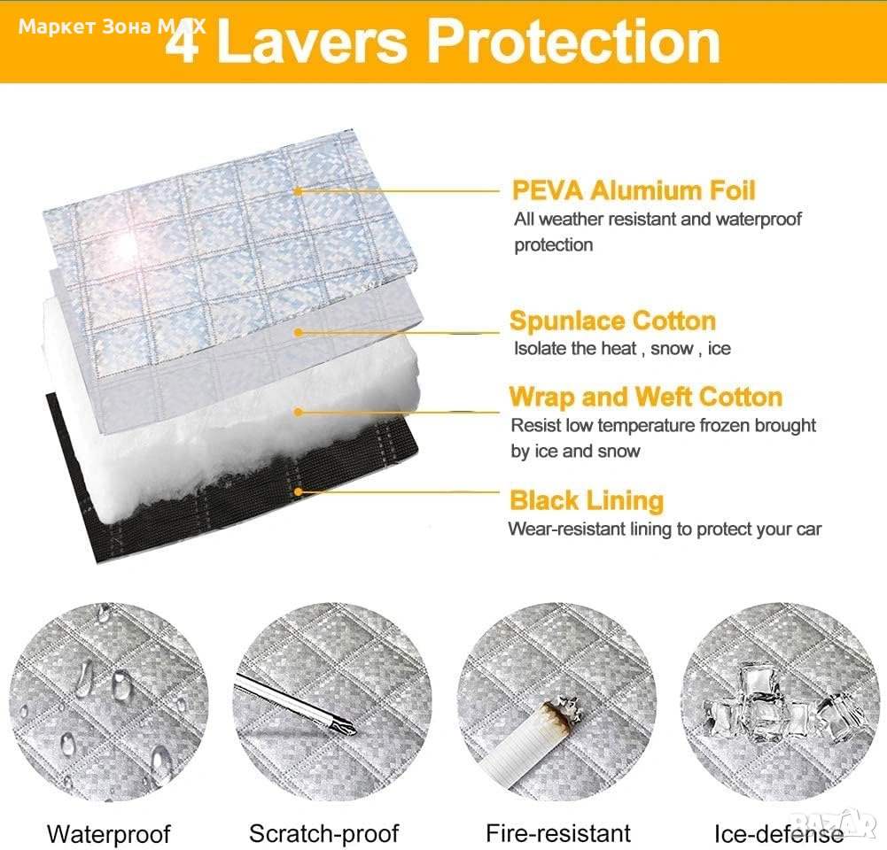 Материал: издръжлива. устойчива на атмосферни условия материя с магнитни ръбове
