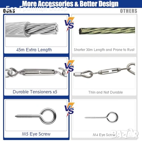 Пълен монтажен сет: обтегачи за регулиране на напрежението + скоби и кримп втулки за сигурни примки