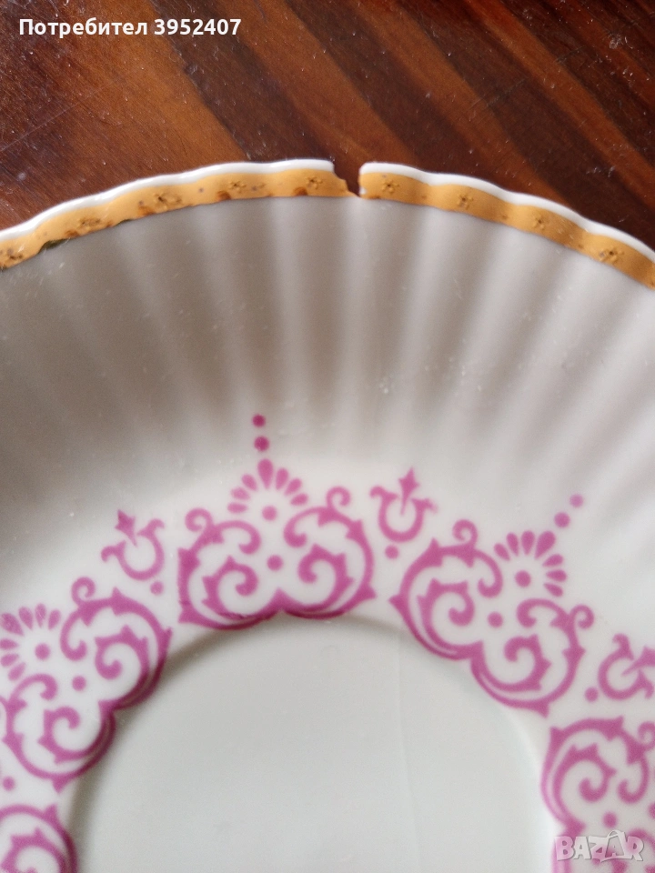 Рядко срещана шарка, от 80те години. Не ползван, дефекта се получи от невнимание в секция, даже не беше изваден и във витрината. Порцелана е много бял, широк златен кант