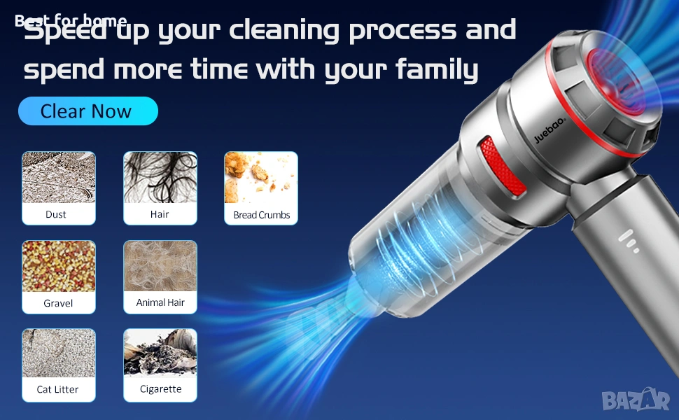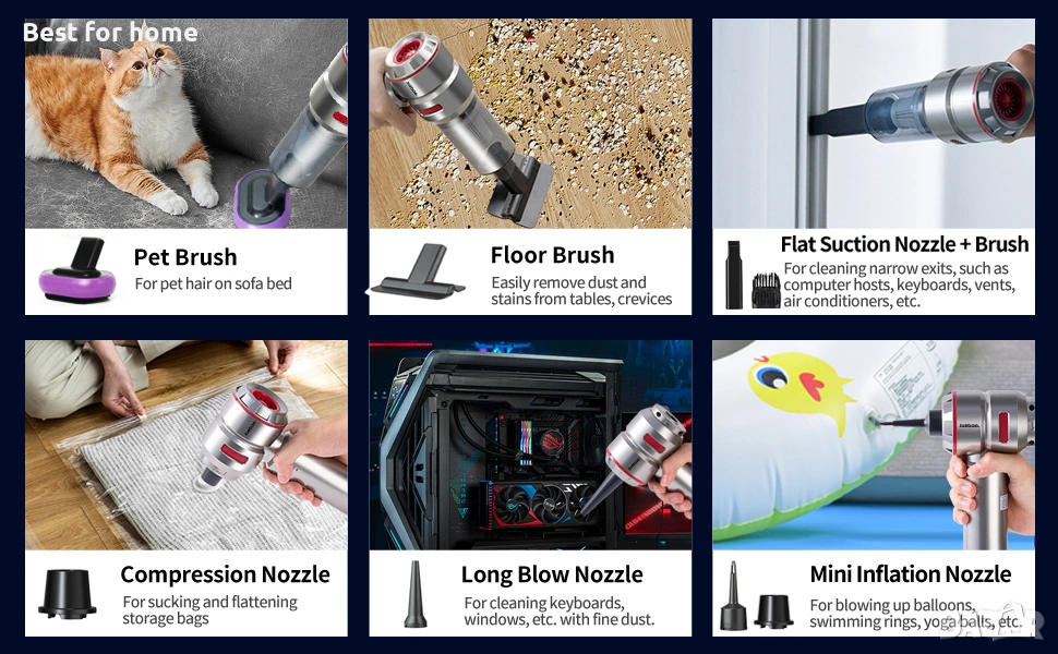Приложимо за различни сценарии: Нашите преносими малки прахосмукачки са оборудвани с 11 професионални аксесоара, които могат да отговорят на всички ваши нужди от почистване. Могат да се използват в различни сценарии, като например автомобили, спалня, кухня, работа и др., за почистване на кухини в автомобили, възглавници на седалки, килими, матраци, легла, маси за клавиатура, компютърно бюро, стълби, басейн, компресионни торби. За разлика от тези на пазара, ние предлагаме и специална четка за домашни любимци, която може да абсорбира по-лесно животински и кучешки косми.