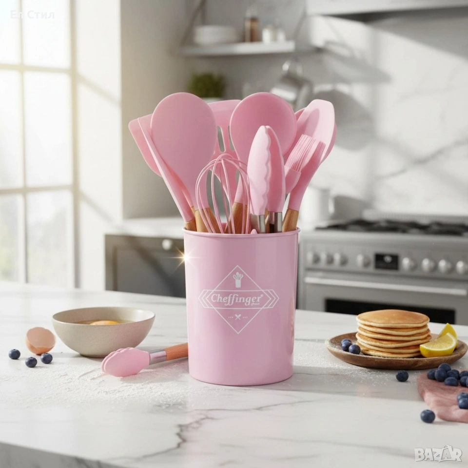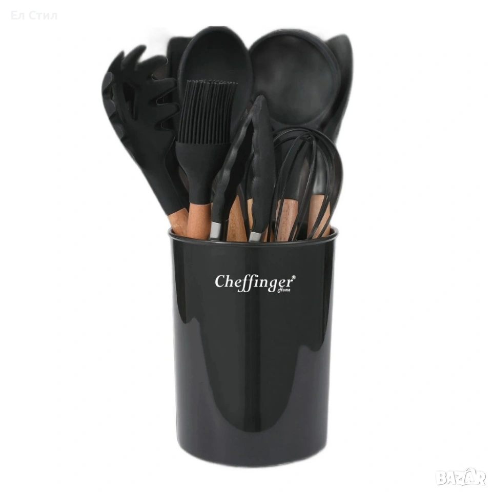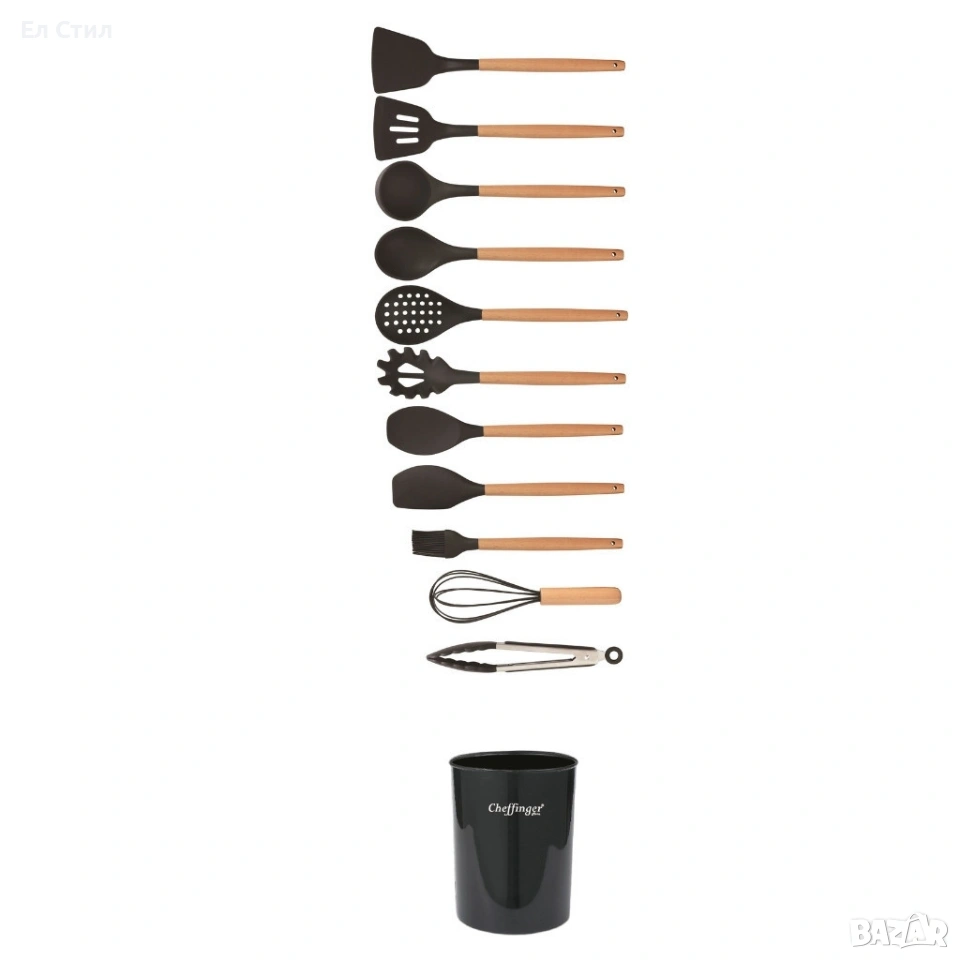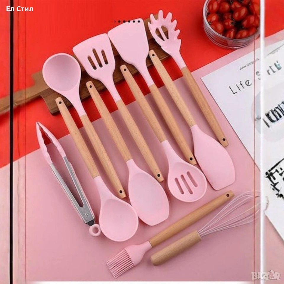 Включени прибори: плътна шпатула, перфорирана шпатула, черпак, плътна лъжица, решетъчна лъжица, прибор за спагети, кръгла шпатула, шпатула за печене, четка за мазане, тел за разбиване, кухненска щипка;