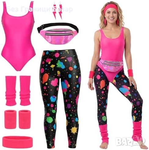 Нов 80s дамски костюм аеробика комплект клин гети лента чантичка L размер