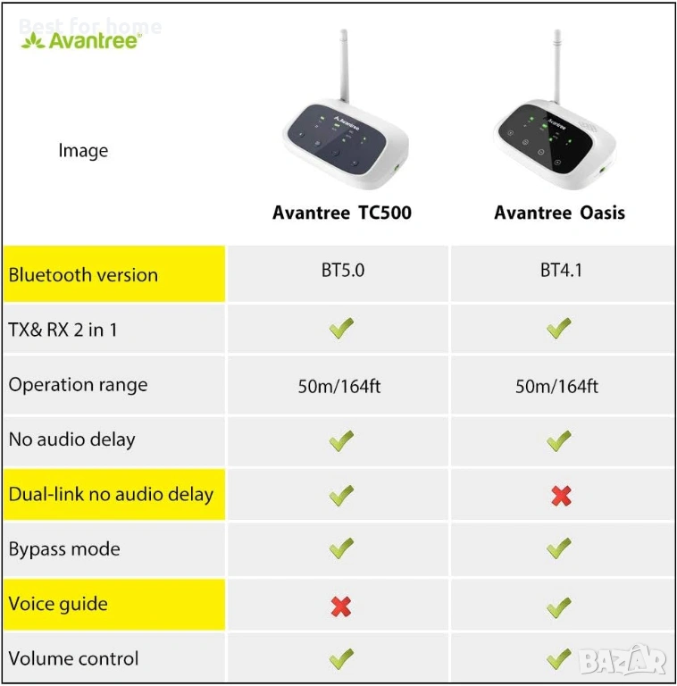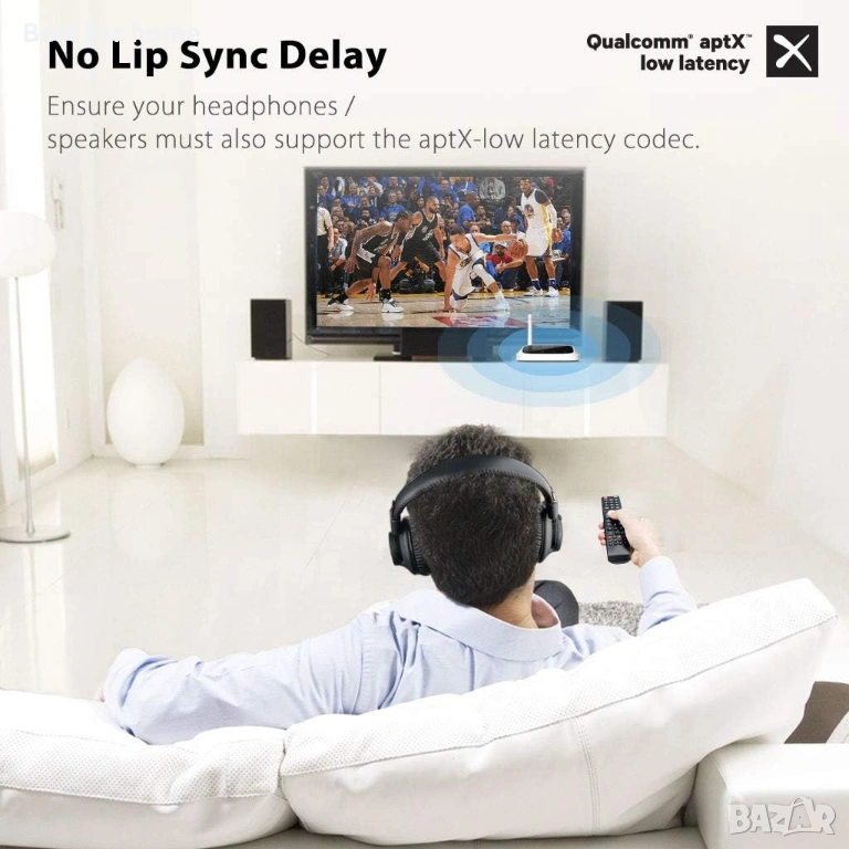 Използва aptX с ниска латентност, за да елиминира забавянето при синхронизиране на устните. Съвместим с устройства с оптични, RCA и AUX аудио изходи.
