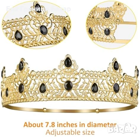 Корона: сплав + черни кристали (rhinestones), златно-черна визия, регулируем диаметър, височина около 5 см (2")