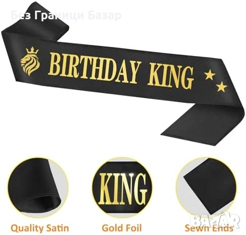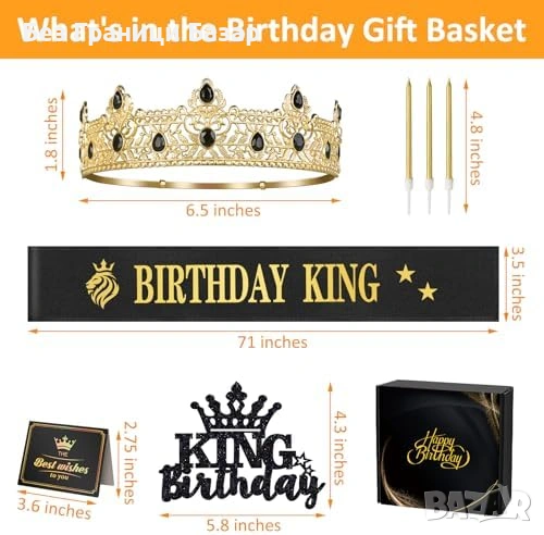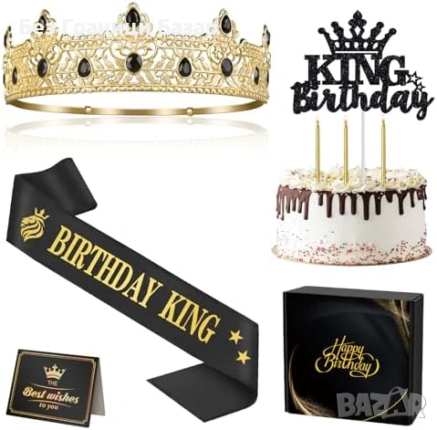Включва: 1x корона „Birthday King“, 1x лента (sash) „Birthday King“, 1x черен блестящ топер за торта, 3x златни свещи, 1x поздравителна картичка, 1x подаръчна кутия „Happy Birthday“
