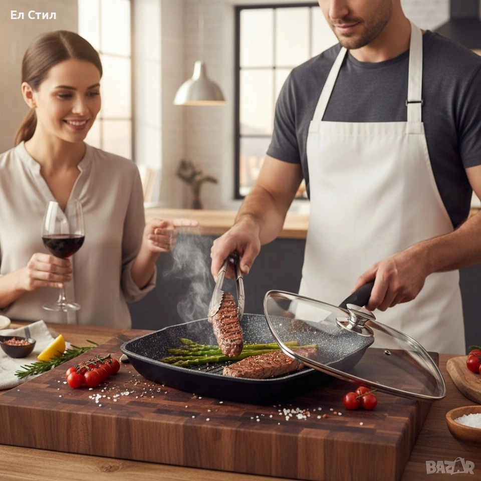 Грил тиган 28см с капак и мраморно покритие Cheffinger – за индукция, с противоплъзгаща дръжка