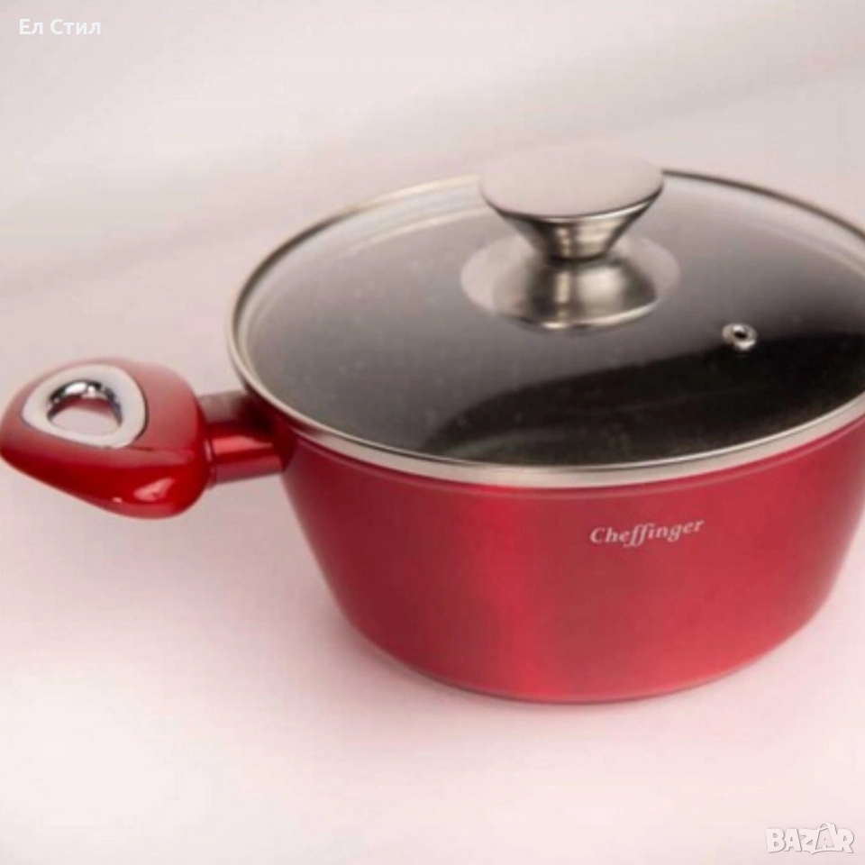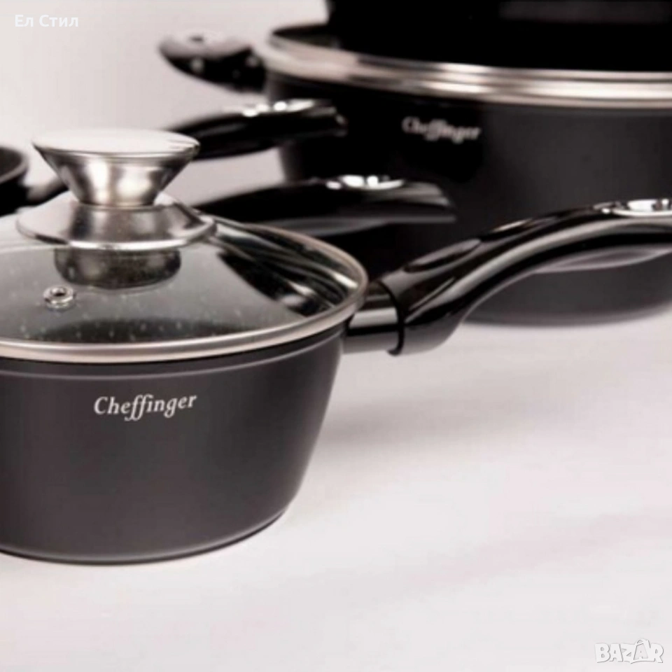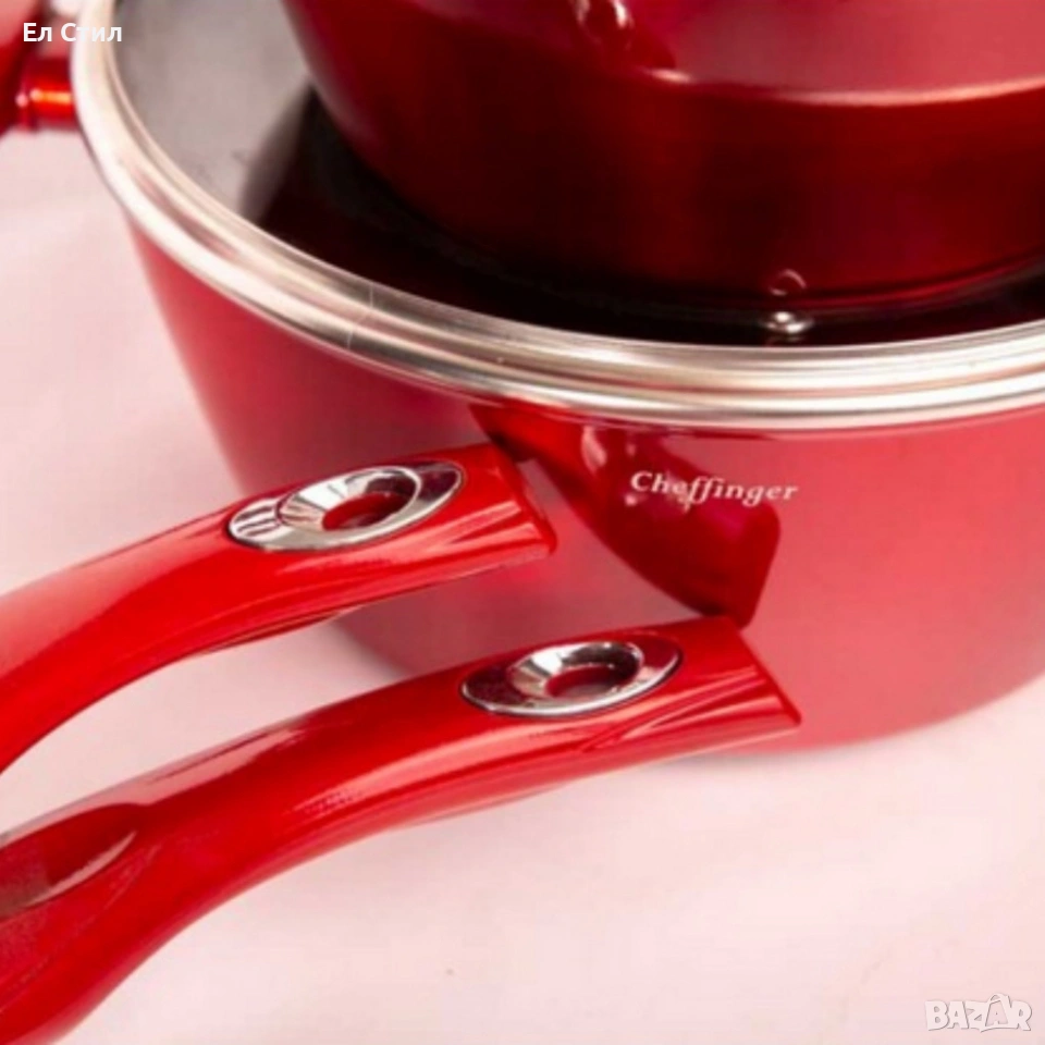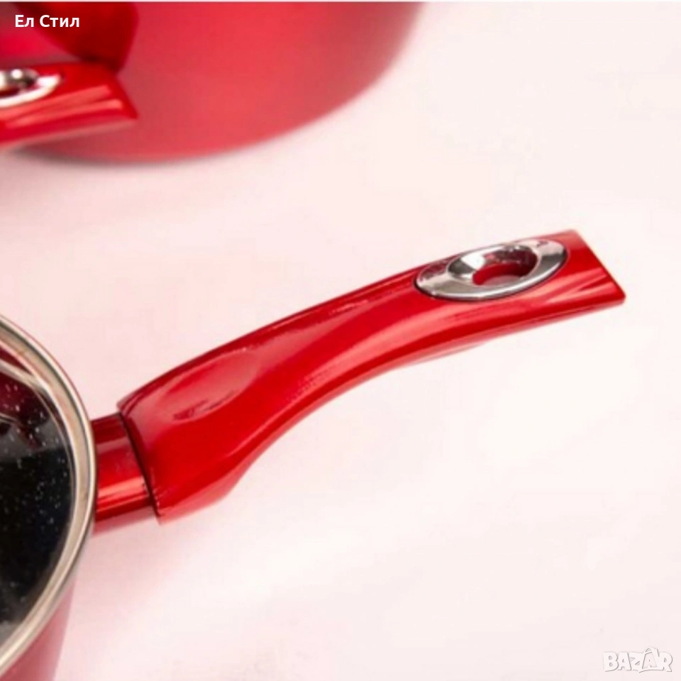 Размери: тенджери 28 см, 24 см, 20 см; касерола 16 см; тигани 28 см и 24 см;