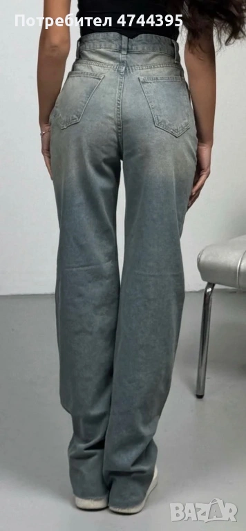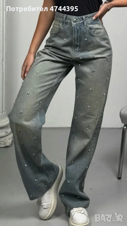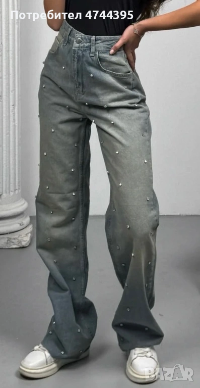 Дънките с широк крачол и висока талия представляват модерен и удобен модел. Високата талия придава елегантност и издължава силуета, докато широките крачоли създават ефект на лекота и свобода на движение. Декорацията с камъни в предната част добавя блясък и индивидуалност на дизайна, съчетавайки стил и креативност. Тези дънки са идеален избор за създаване на модерен, но комфортен външен вид.