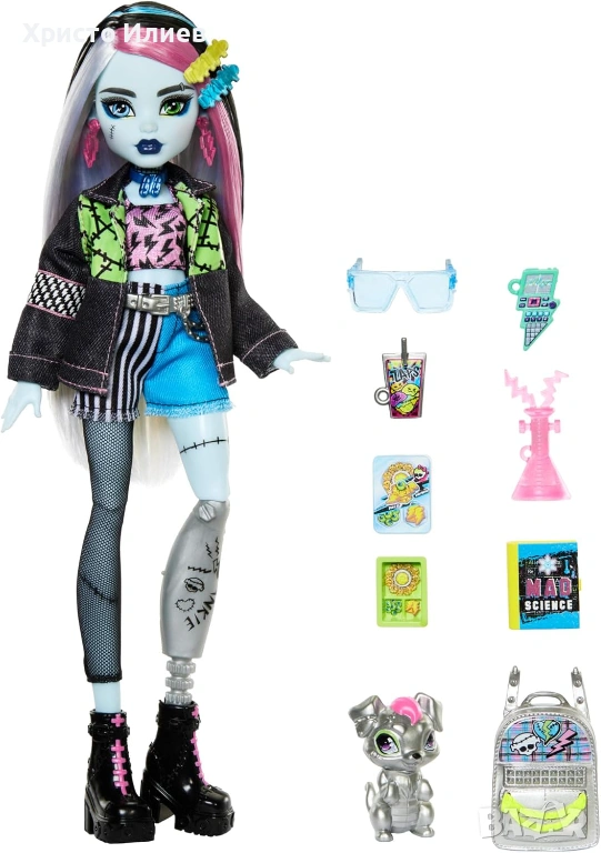 Франки има зашеметяваща визия, която ще впечатли всеки. Тя носи черно дънково яке, стилен розов потник, къси панталони и черни ботуши. Нейният домашен любимец - кучето Франки Уотзи, което не се отделя от нея и блести с метален сребрист оттенък. Момиченцата могат да стилизират цветната косата на Франки както пожелаят. В комплекта малчуганите ще открият и разнообразие от аксесоари, които включват раница, слънчеви очила, обеци, калкулатор във формата на светкавица и други. Те са прекрасно допълнение към визията на куклата и ще помогнат на забавните истории на малчуганите да оживеят.