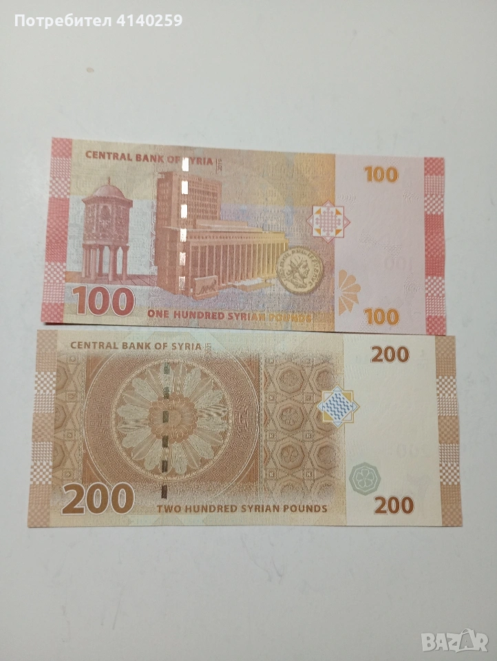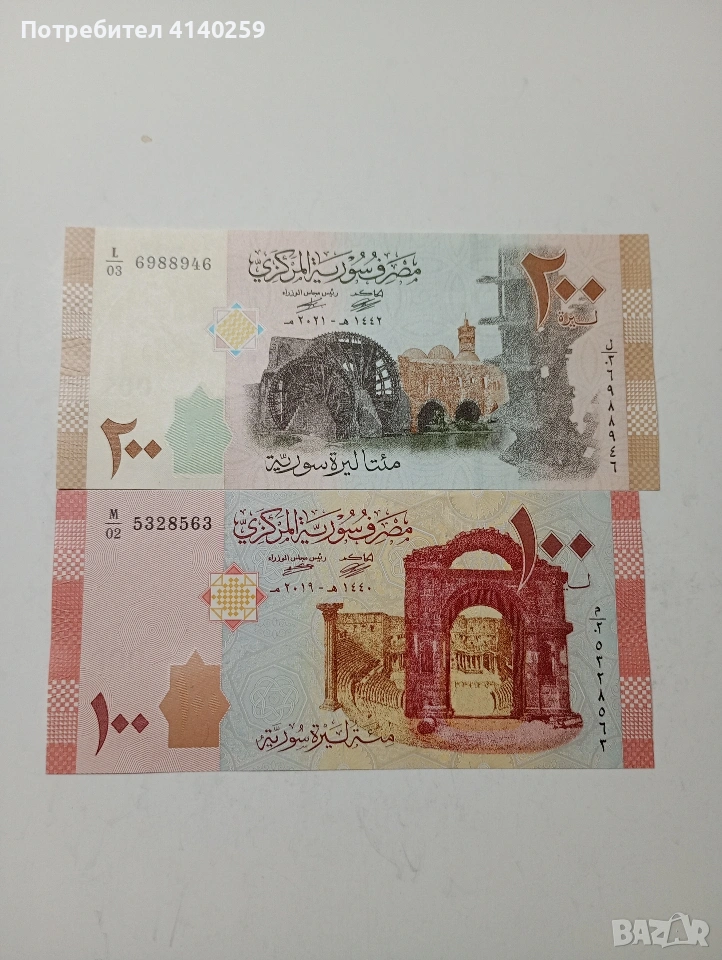 СИРИЯ БАНКНОТИ 200 ПАУНДА 2021 Г 100 ПАУНДА 2019 Г СЪСТОЯНИЕ НОВО ЦЕНА ЗА 2 БРОЯ ПОЛУЧАВАТЕ СНИМАНИТЕ БАНКНОТИ РАЗГЛЕДАЙТЕ ДРУГИТЕ МИ ОБЯВИ ДА КОМБИНИРАТЕ ДОСТАВКА ЕКОНТ ЗА ВАРНА ЛИЧНО