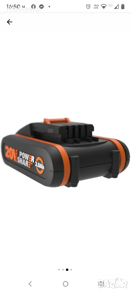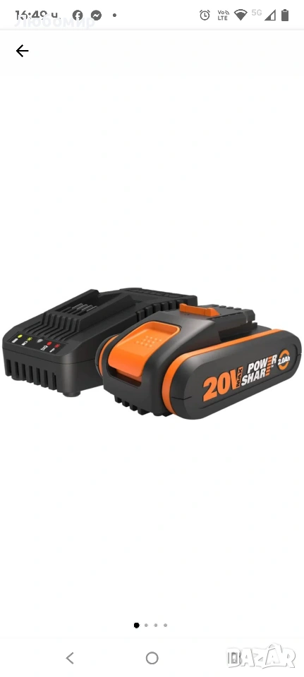 WORX WA3601, 20V, 2Ah с индикатор, Съвместими с технологията WORX PowerShare.Комплектът Worx WA3601 се състои от резервна батерия 20 V/2,0 Ah и бързо зарядно устройство. С бързото зарядно батерията може да се зареди напълно само за 60 минути. Съвместим с всички инструменти 20V WORX.