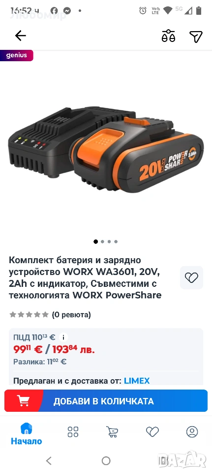 Комплект батерия и зарядно устройство WORX WA3601, 20V, 2Ah