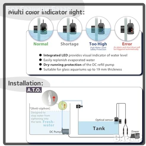 Автоматична ATO система за доливане при изпарение за сладководни и соленоводни аквариуми
