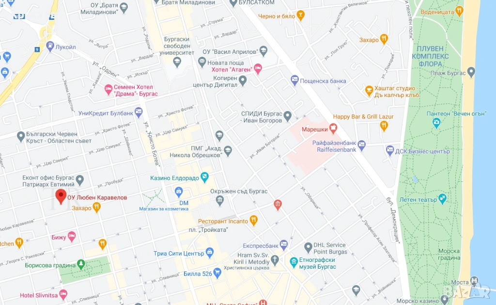 В жилом районе Вазраждане, на улице Любена Каравелова, рядом с одноименной школой.