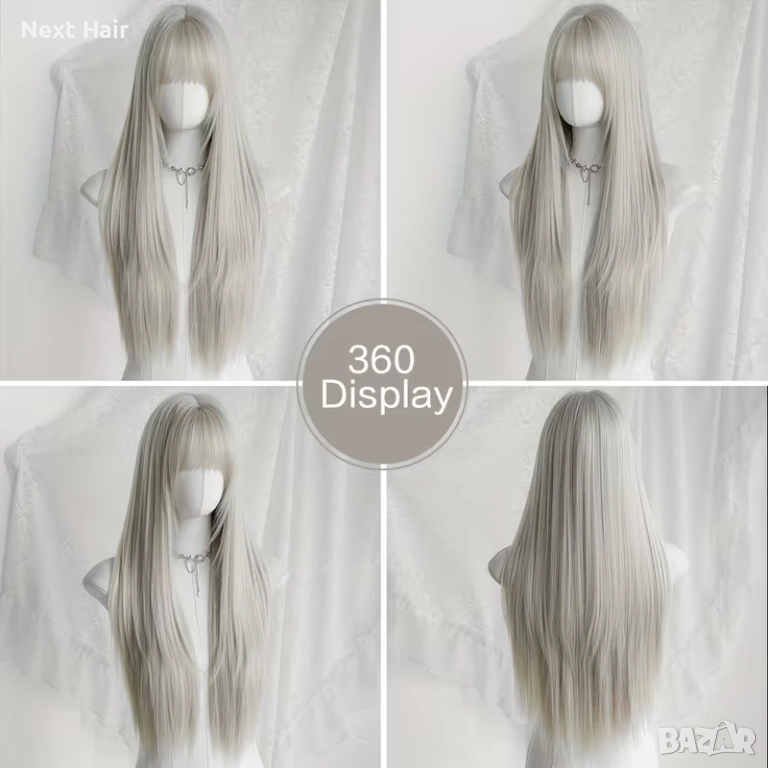 Придайте си впечатляваща и модерна визия със светло сребристо руса перука с дължина 73 см. Моделът е с права текстура и стилен плътен бретон, който красиво оформя лицето и подчертава чертите.