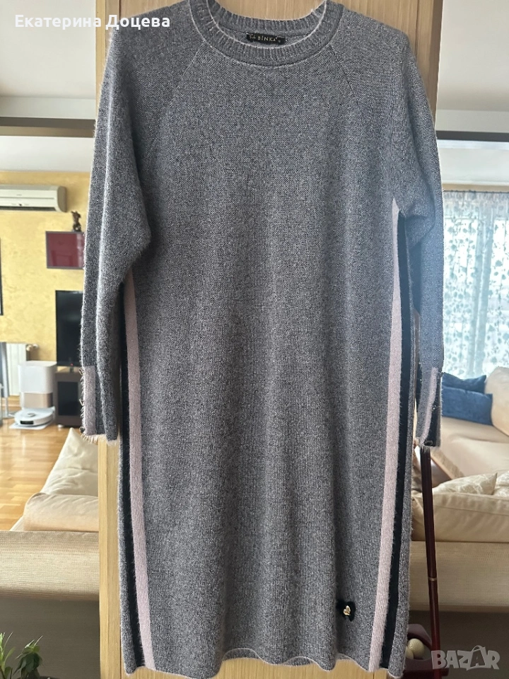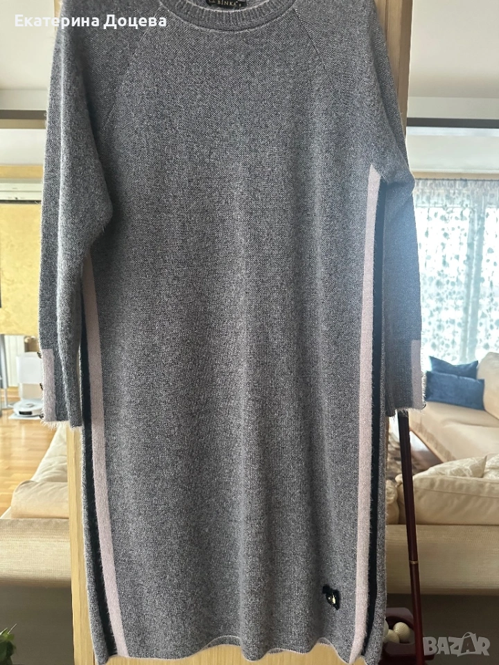 Светлосива рокля пухкаво плетиво с розов и черен страничен кант. По етикет s размер, но отговаря на голям s, или М.