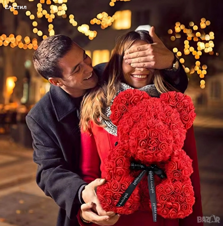 Плюшено мече с LED рози - подарък за мама, момиче, баба - комплект вечни рози 25 см