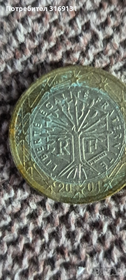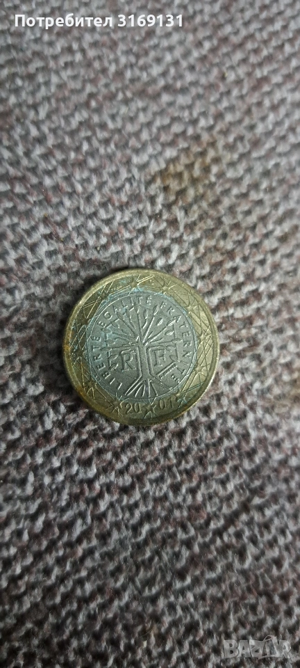 Монетата е 1евро Дървото на Живота-2001год.Сечена 1гпреди пусканато в о ръщение. Франция.Много рядка монета.Дефект- двете нули на годината застъпват сребърния кръг.