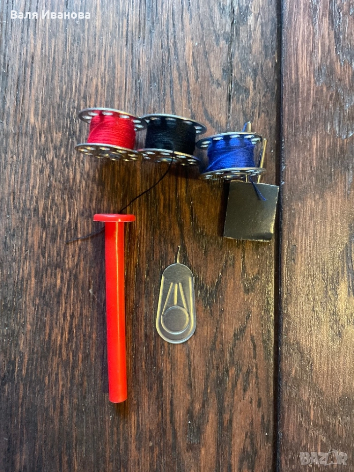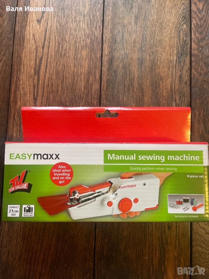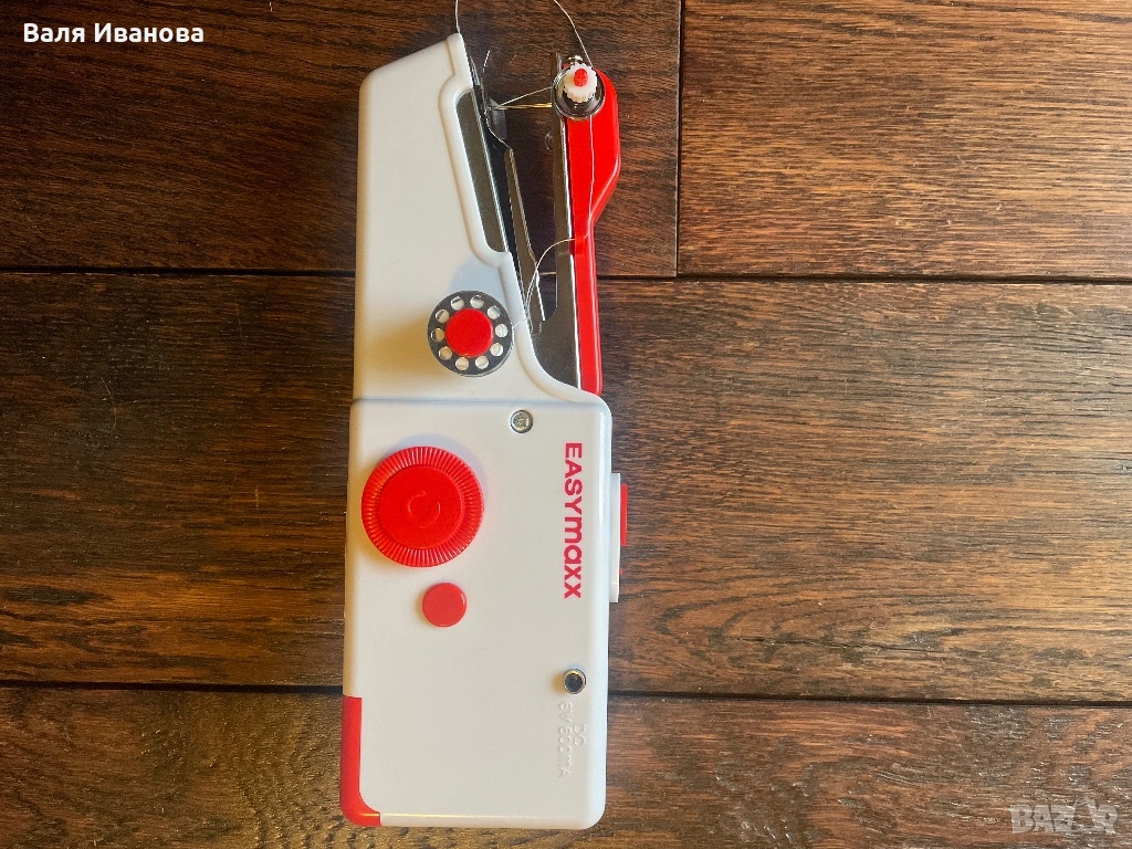 Ръчна мини шевна машина идеална за път и бързи поправки в бита. Подарък ми е и само съм я отворила, за да я видя, но не съм я ползвала.