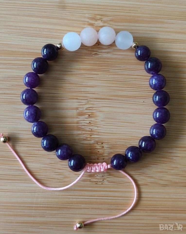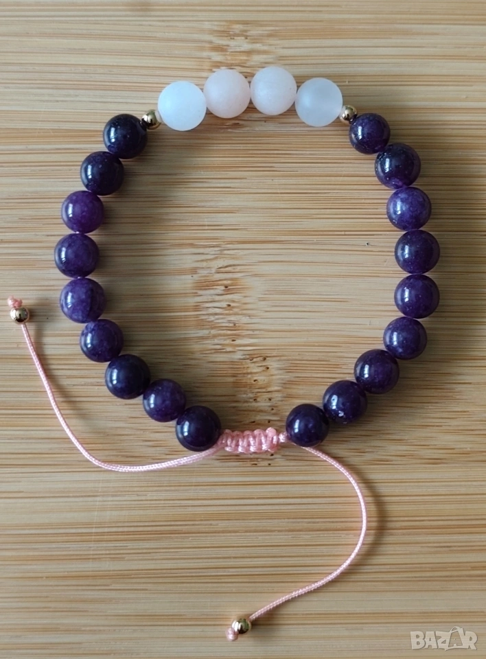 Комбинацията съчетава дълбочината и спокойствието на аметиста с меката, нежна енергия на матовия розов кварц. Подходяща за ежедневно носене или като стилен подарък с послание.