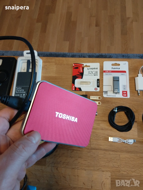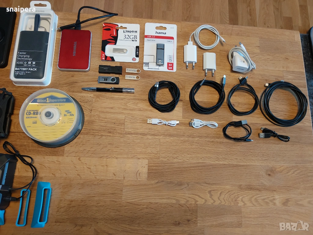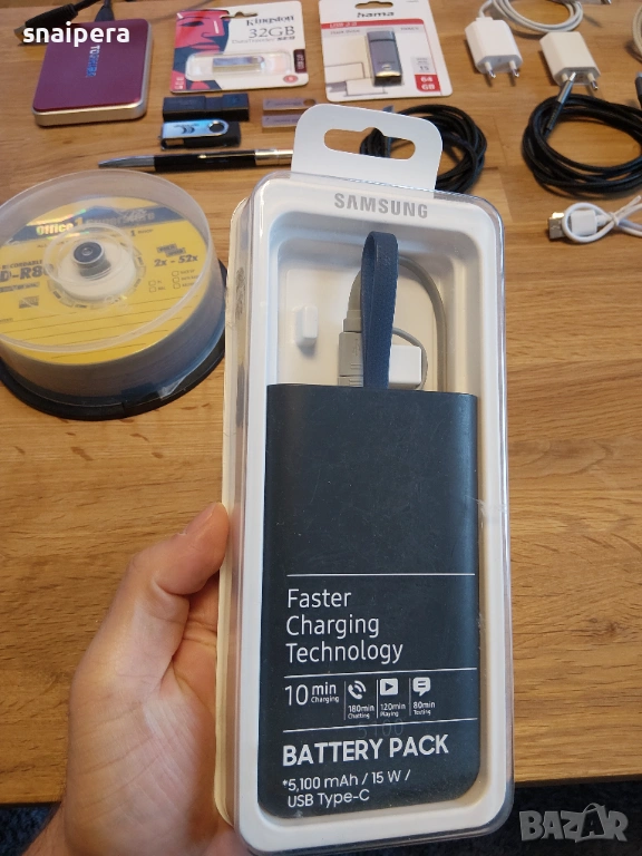 Оригинална външна батерия на Самсунг - 5100 mAh ( има накрайник за USB-C и Микро USB) Батерията отвън малко лепка защото се опитах да я изчистя с влажна кърпичка и нещо не стана. Може с някакъв друг препарат да се махне лепкавото :)
