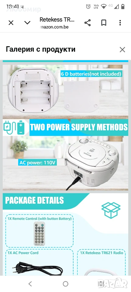 2 захранвания; захранване AC 220V (кабелът е включен); 6 батерии размер D (не са включени); дава ви свободата да го използвате