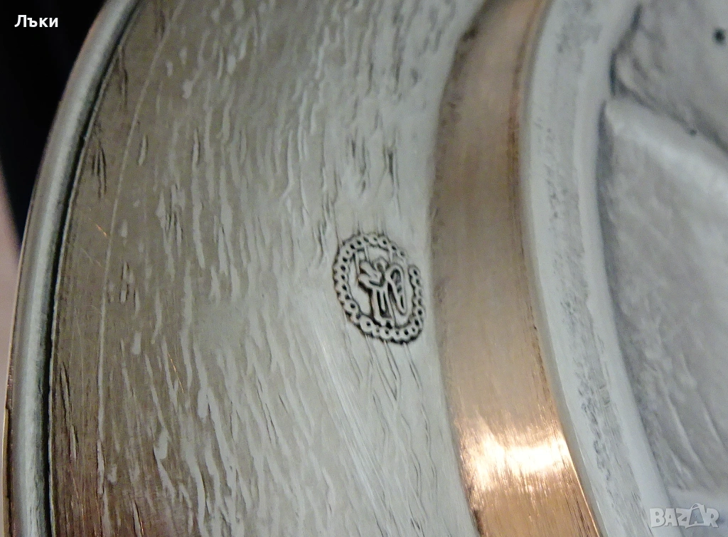 изработка от 95% калай и 5% сребро,маркирана с печат на производителя.В центъра