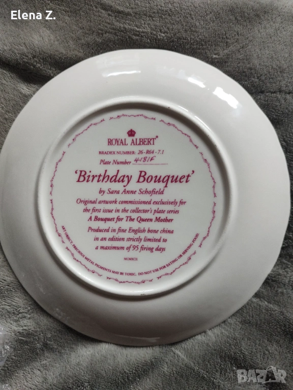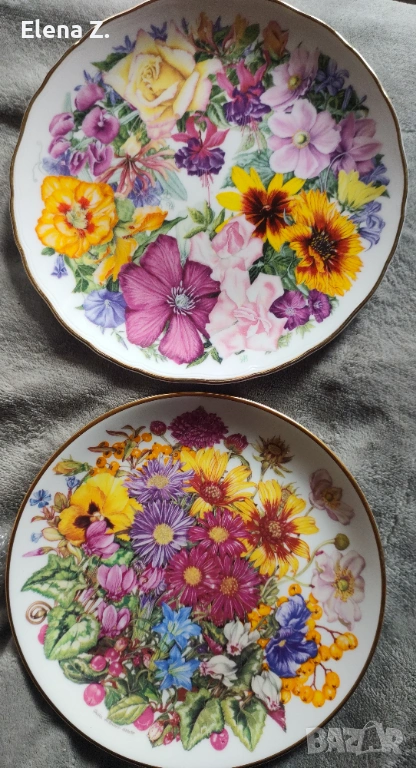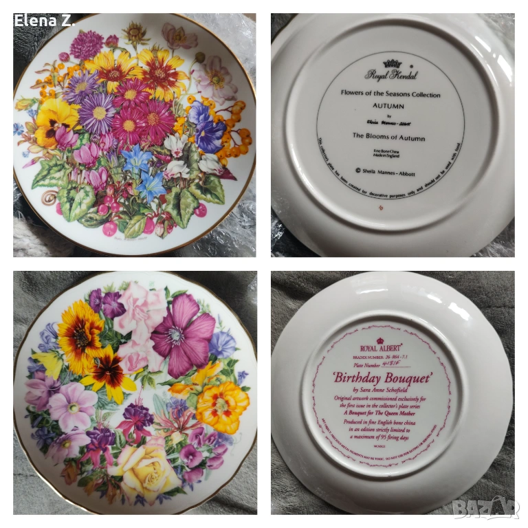 Комплект от две чинии с красиви букети - едната на Royal Albert e Birthday Bouquet (букет за рожден ден) е направена от фин костен порцелан, по картина на Sara Ann Schofield, и е първата от лимитираната серия "Букет за Кралицата Майка". Номерирана, записана в регистъра на Bradex. Диаметър 21см. В отлично винтидж състояние.