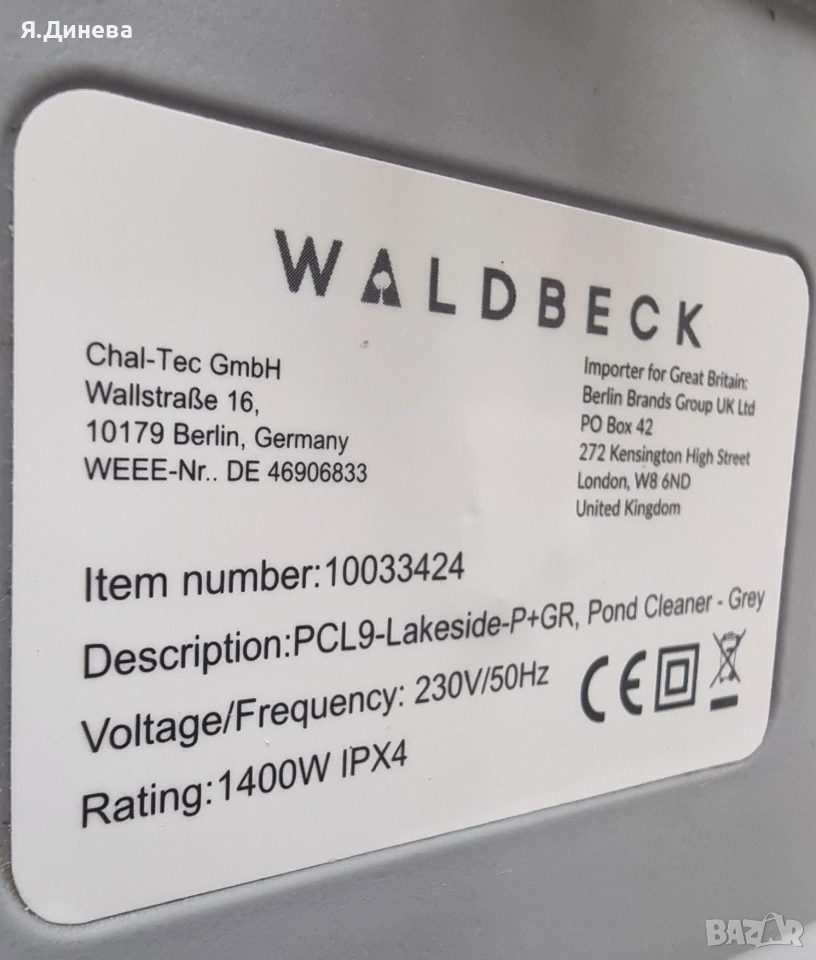 Продавам прахосмукачка Waldbeck 1400w за басейн. Прахосмукачката е