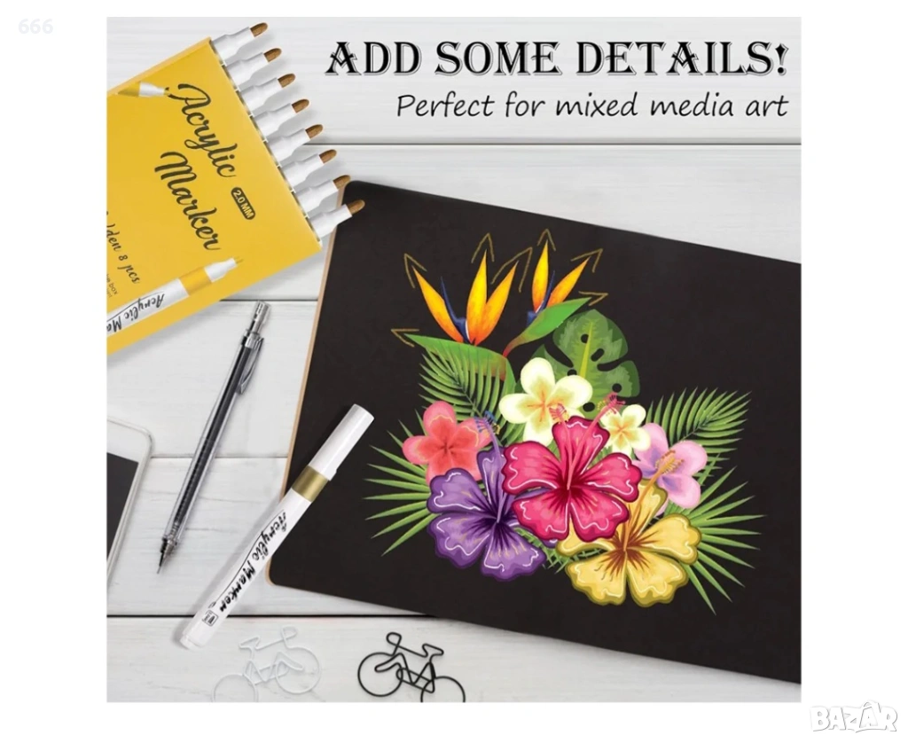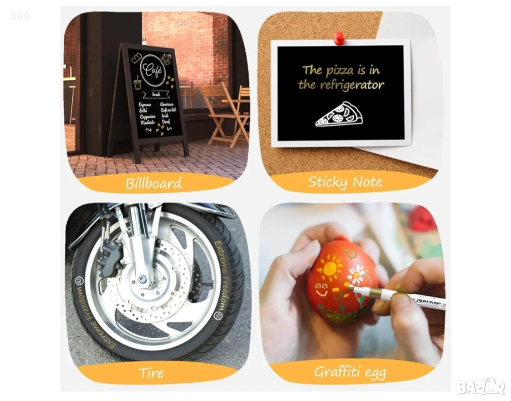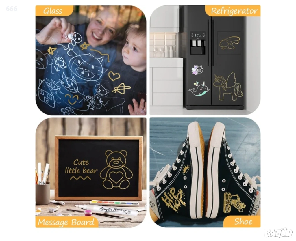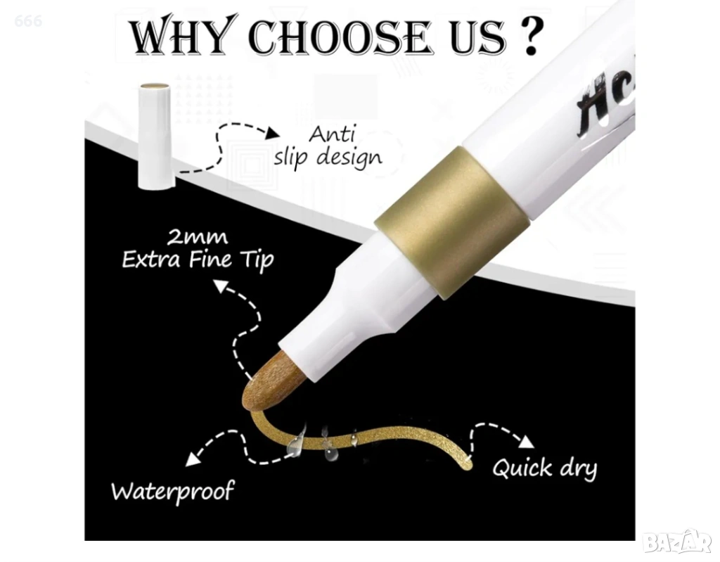 【ПРЕМИУМ КАЧЕСТВО】Маркерът с екстра фин златен връх използва ярко, бързосъхнещо акрилно мастило, което създава много издръжливо, непрозрачно и гланцово покритие върху почти всяка повърхност.