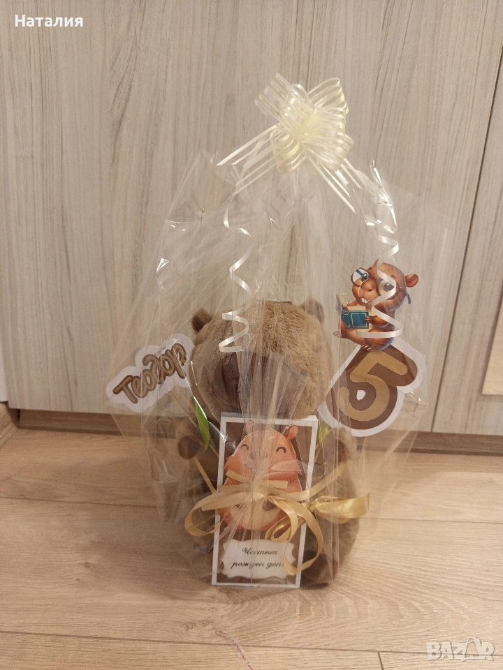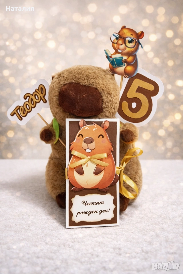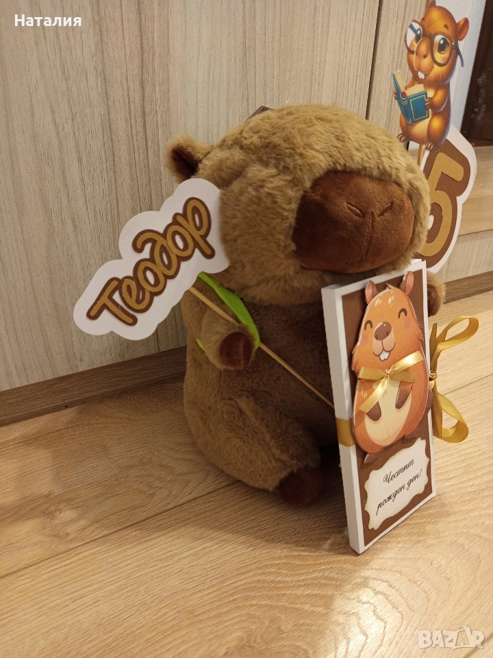 Плюшена играчка Капибара с кутийка за шоколад и пари, и персонализиран надпис.