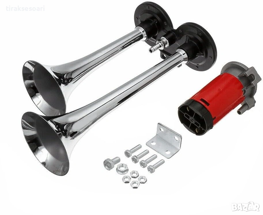 тромба 12v, клаксон 12v, двойна тромба, сирена за кола, клаксон с компресор, тромба хром, въздушна сирена 12v, клаксон за камион, автомобилен клаксон, мощна сирена 135db
