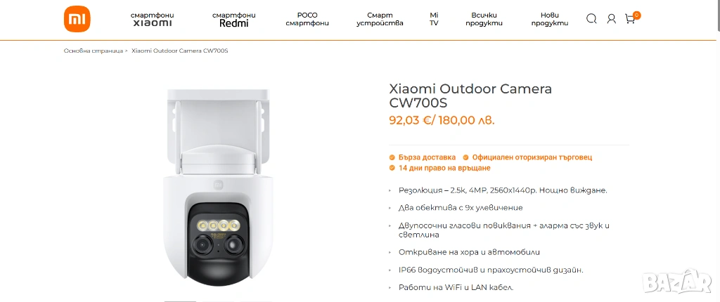 Продавам Нова външна умна камера Xiaomi Outdoor Camera CW700S. Използва се за наблюдение на външните пространства и осигурява качествено видеонаблюдение. Продукта е нов з оригинална непокътната опаковка. Изпращам с тест и преглед и възможност за лично предаване.