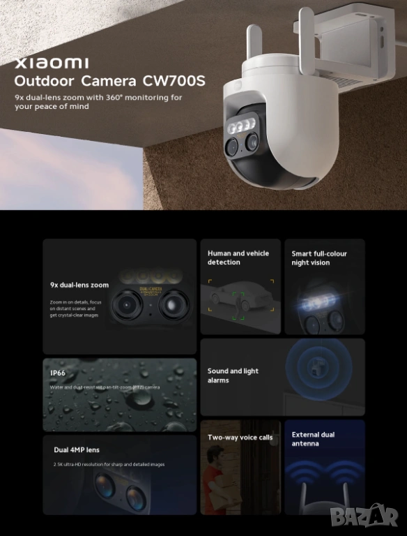 С външната камера Xiaomi CW700S имате пълен контрол над вашето външно пространство. Телеобективът и 9x широкоъгълният обектив ви позволяват да приближавате детайлите и да проследявате всяка точка с прецизност. 4MP камерата и 2.5K ultra-HD резолюцията ви осигуряват ясни и ярки изображения, за да не пропуснете нищо.