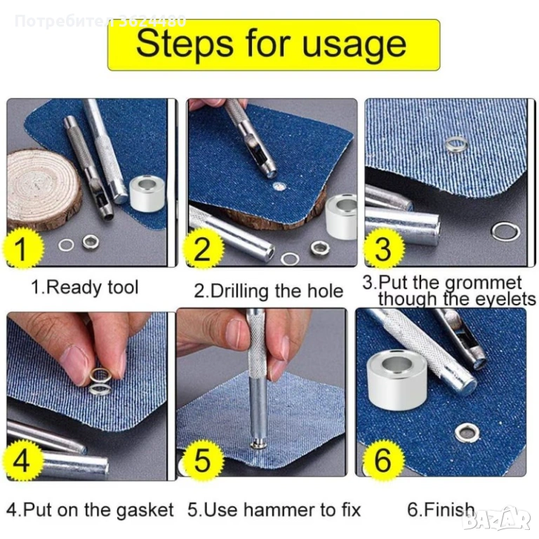 Лесна употреба: С включената замба пробивате дупката, а с поансона и наковалнята фиксирате капсата здраво върху материала.