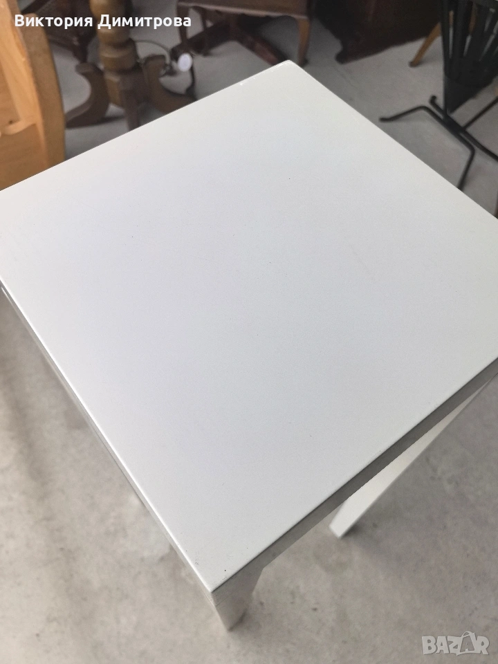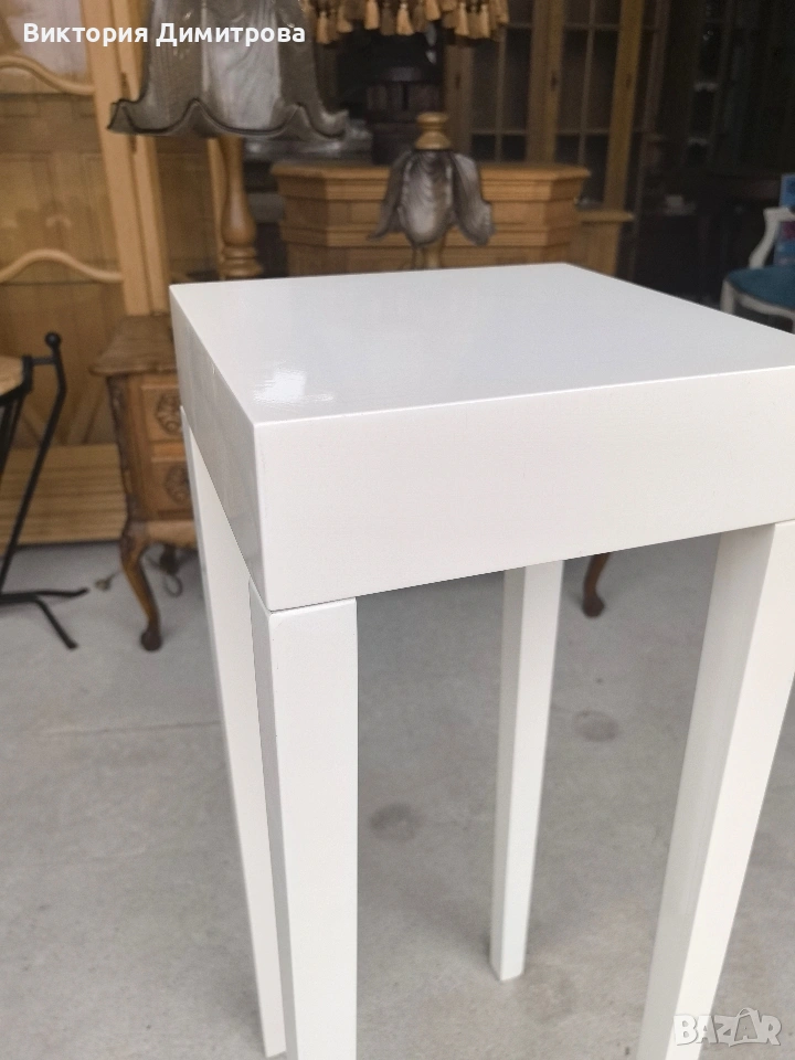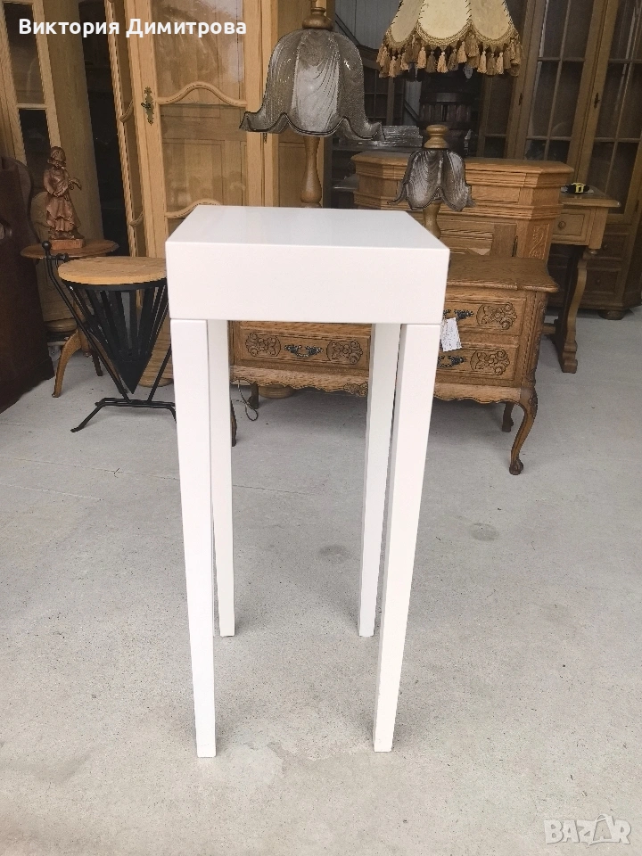 " Помощна маса - поставка за торти ✨️ Елегантен дизайн ✨ Плот от Висококачествен МДФ ✨️ Краката за изработени от дърво ✨️ Лъскаво бяло покритие за ярък и модерен ефект ✨️ Отразява светлината и създава визуален ефект за пространството ✨️ Универсална функционалност: поставка за статуетки, за цветя, странична маса.... Или като акцент ✨ Компактен размер 📚 При поръчка: код 01-057 ⚜️⚜️⚜️ Цена: 75.00 € ⚜️ Статус: Налична ⚜️⚜️⚜️ Размери: Широчина: 35 см. Дълбочина: 35 см. Височина: 90 см. ⚜️⚜️⚜️ Втора употреба! В много добро ретро състояние! 👉Възможно е да има леки следи от употреба и/ или износване! Внос Германия! 🇩🇪🇩🇪🇩🇪