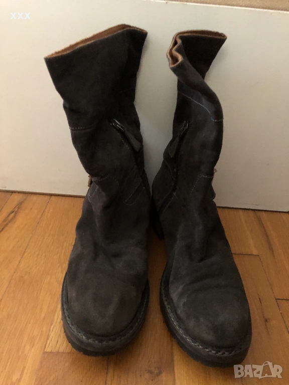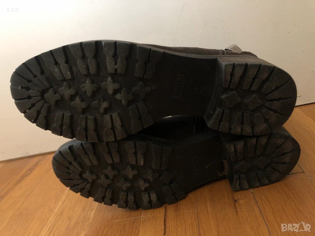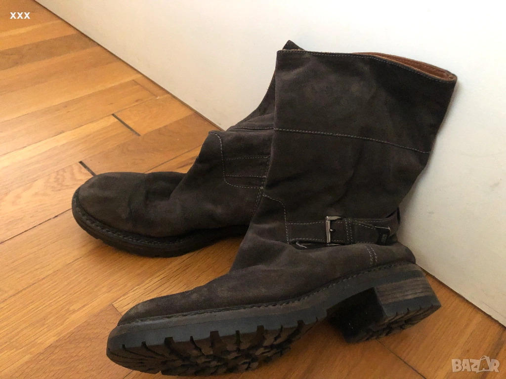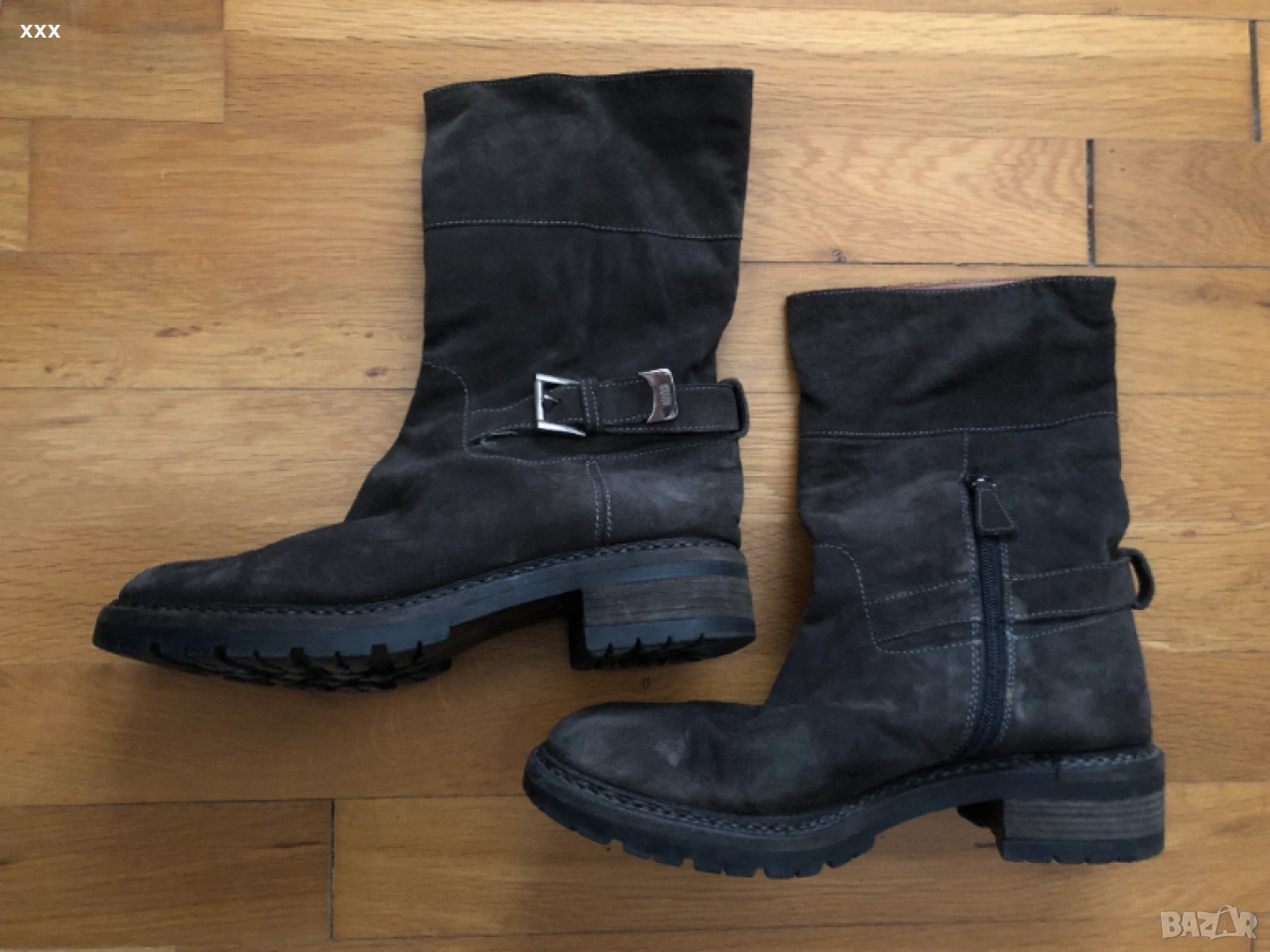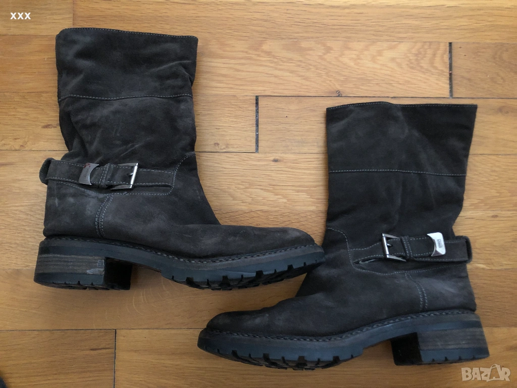 Дамски велурени боти Armani Collezioni, размер 39. Естествен велур в ефектен кафяв цвят с леко масленозелен оттенък. Стабилна грайферна подметка. Леки и удобни,