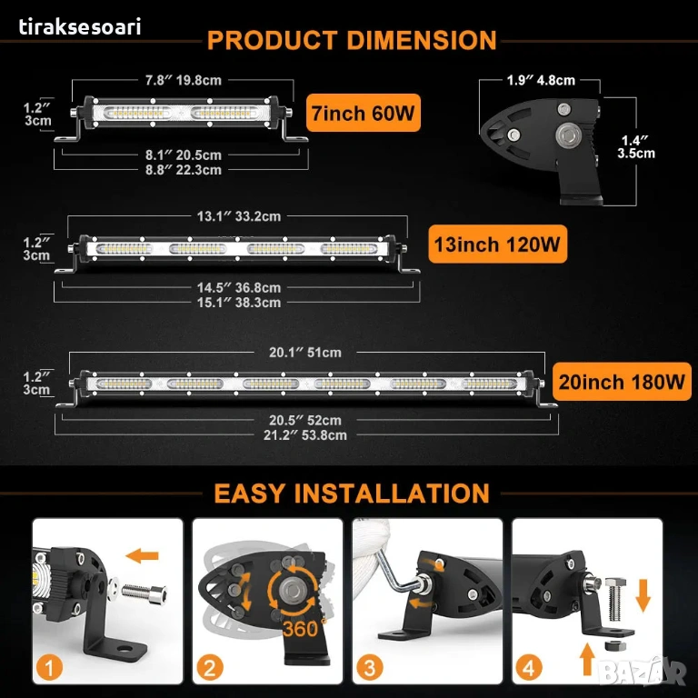 LED барът осигурява ярка бяла светлина 6000K за отлична видимост при нощно каране и тежки условия. Конструкцията е водо-, прахо- и удароустойчива, което гарантира дълъг експлоатационен живот.