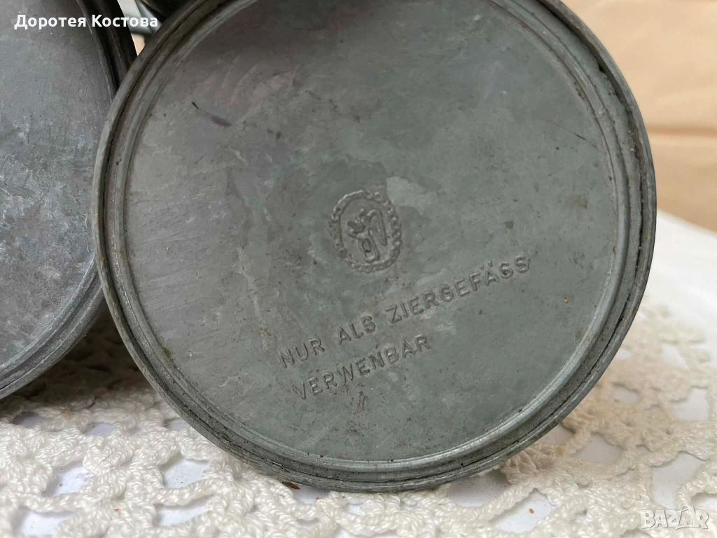 Красиви кани от цветен метал от Германия / вероятно цинкови / с маркировки, 3 бр, размерите са на снимките, не са почистени, с капаци. Обща цена - 29 евро / 56.72 лв.