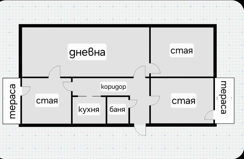 Разпределението е функционално и удобно: просторно антре, светла дневна, кухненски бокс, три самостоятелни спални, баня с тоалетна и две тераси. Жилището е в прилично състояние и дава възможност както за директно обитаване, така и за модернизация според личния вкус.