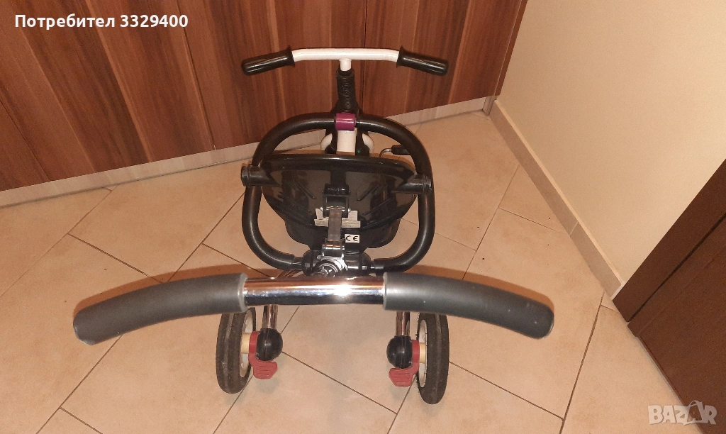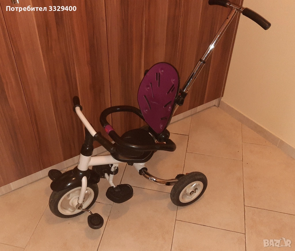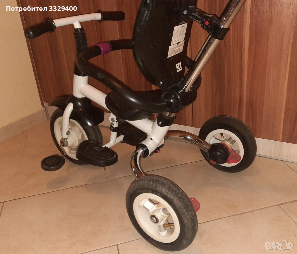 Продавам детска триколка с помпащи се гуми. Много е запазена – технически и визуално. Със задни спирачки. Може да се управлява и от детето и от родител. С регулируема дръжка. Разполага и със степенки за детето. За деца до 6 години и до 30 кг. За инфо –