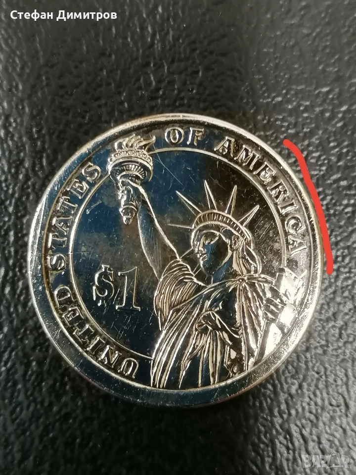 Колекционерска монета от серията президентски долари. Портрет на Джеимс К. Полк 11 президент на САЩ 1845-1849г. Монетата е с изместен център на едната страна. Имам още други монети с грешки.